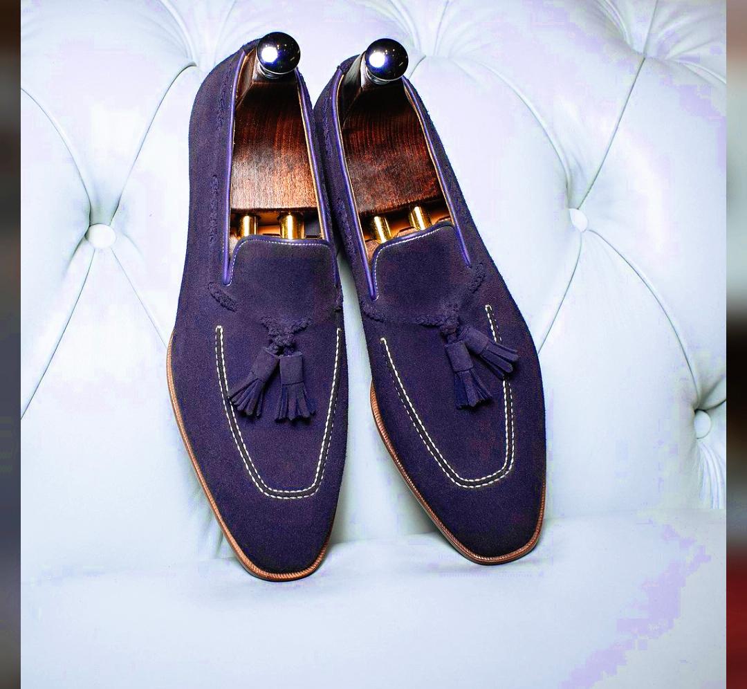 Navy Blue Tasseled Handmade Slip On Moccasin Suede Men's Shoes