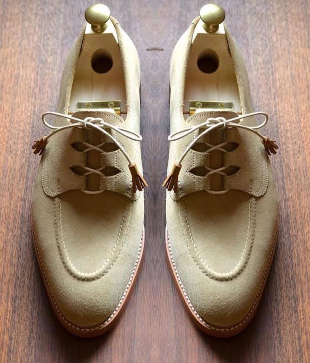 Beige Suede Criss Cross Lace Up Dress Shoes For Men's Handmade Shoes