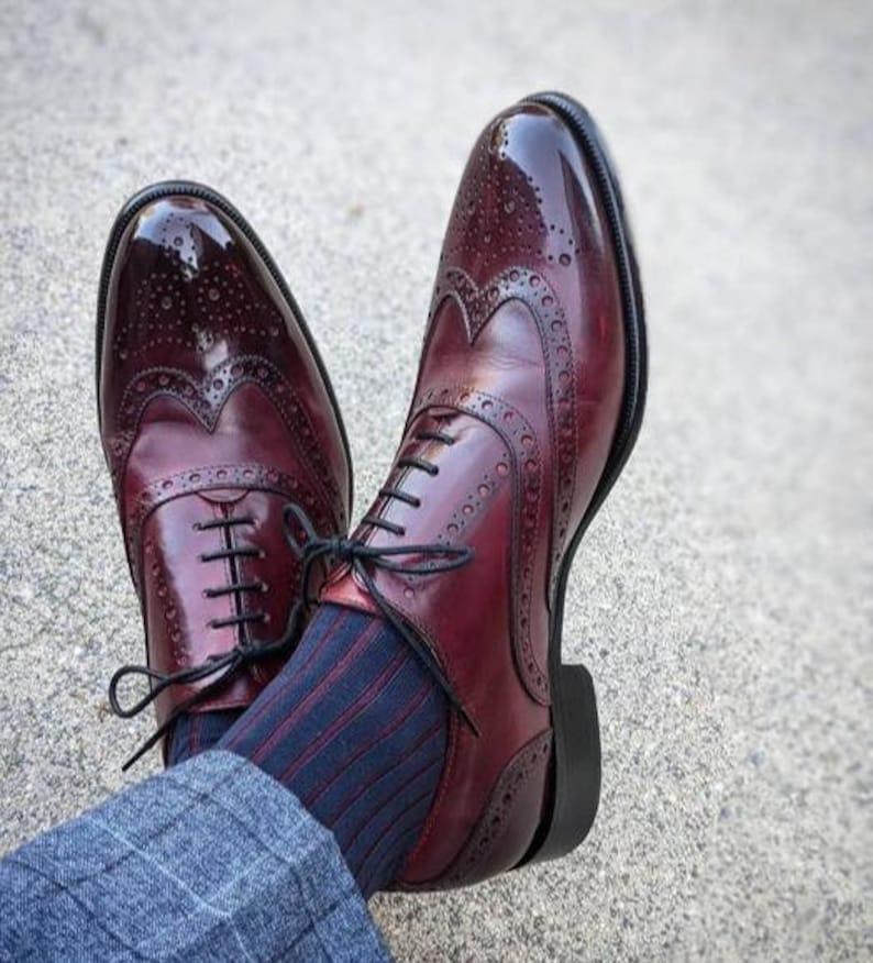 New Pure Handmade Burgundy Leather Lace Up Brogue Shoes For Men's