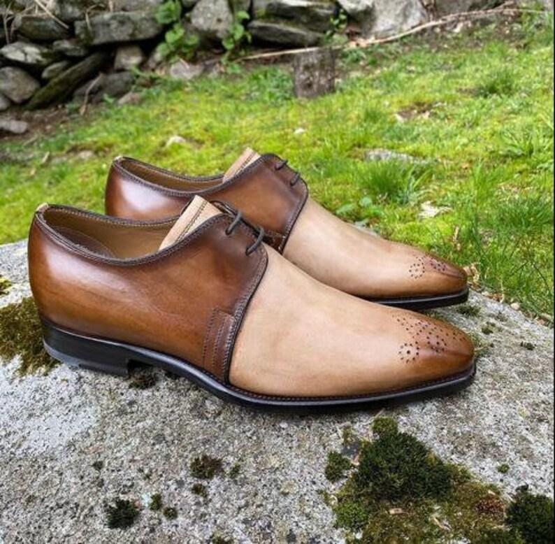 New Pure Handmade Beige & Brown Shaded Leather Stylish Lace Up Shoes For Men's