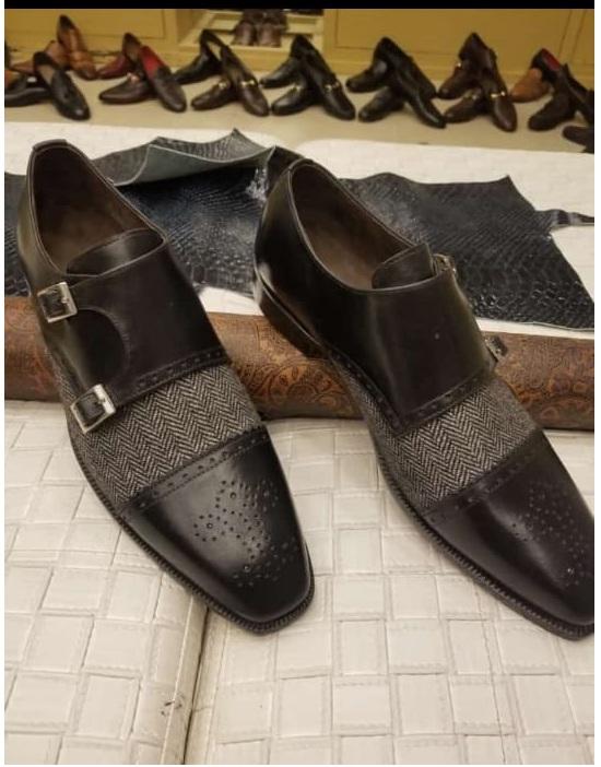 Handmade Men's Double Monk Strap Brogue Shoes, Men's Black Gray Tweed Leather Cap Toe Shoes