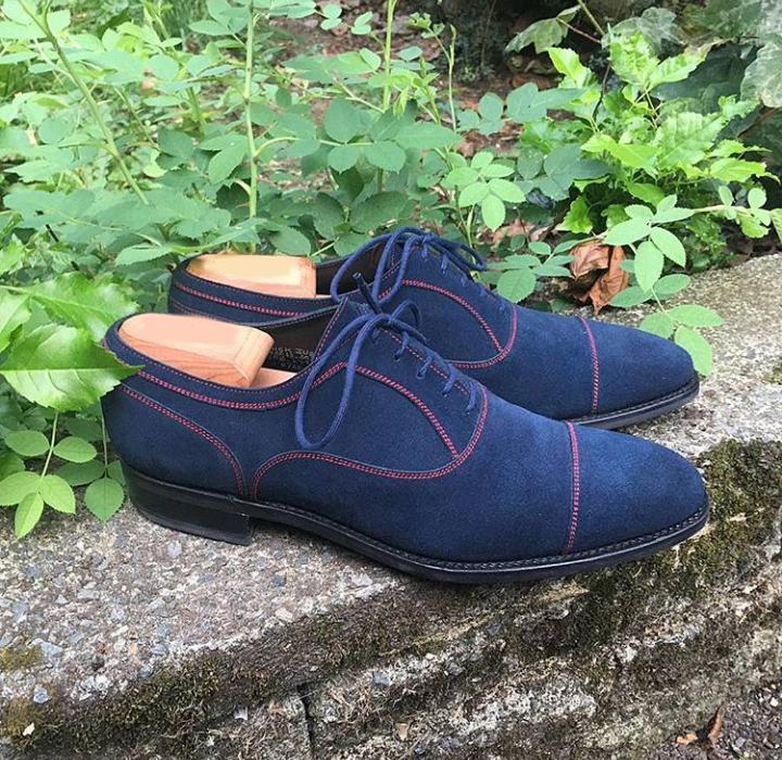 Handmade Navy Blue Suede Shoes , Men's Cap Toe Lace Up Shoes