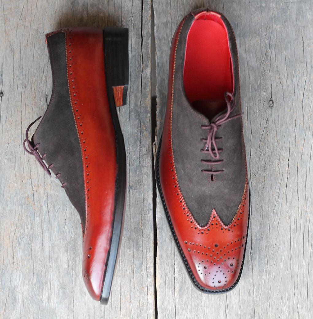 Men's Handmade Burgundy & Gray Wing Tip Brogue Lace Up Leather & Suede Shoes