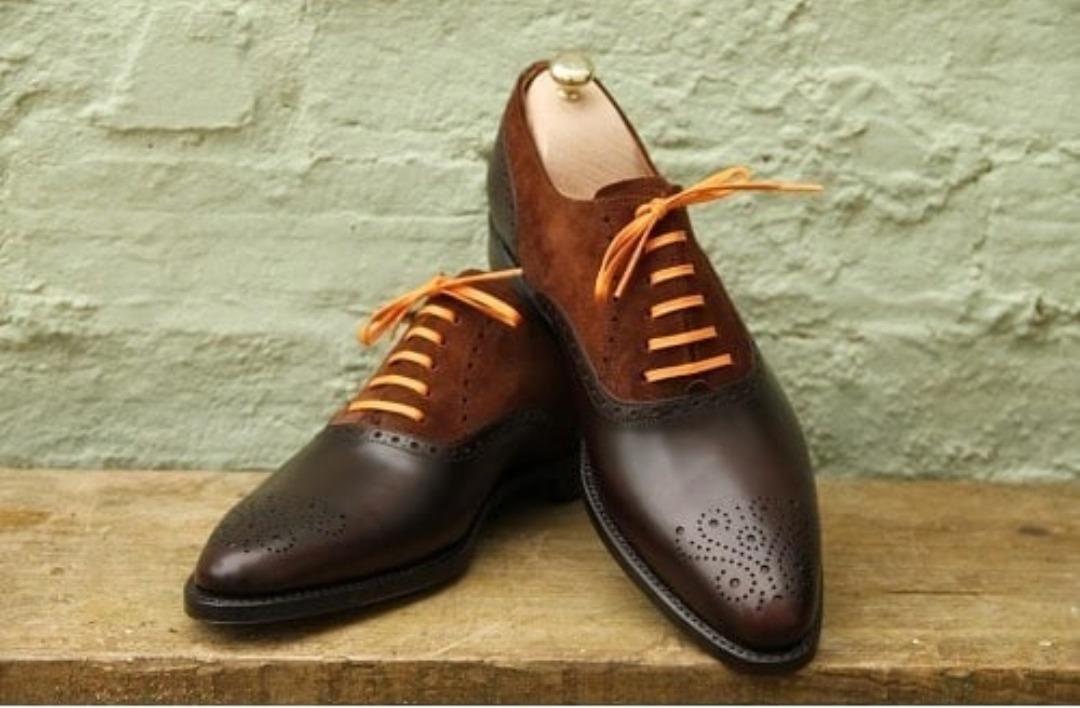 Men's Handmade Brown Brogue Toe Leather Suede Lace Up Oxford Dress Shoes