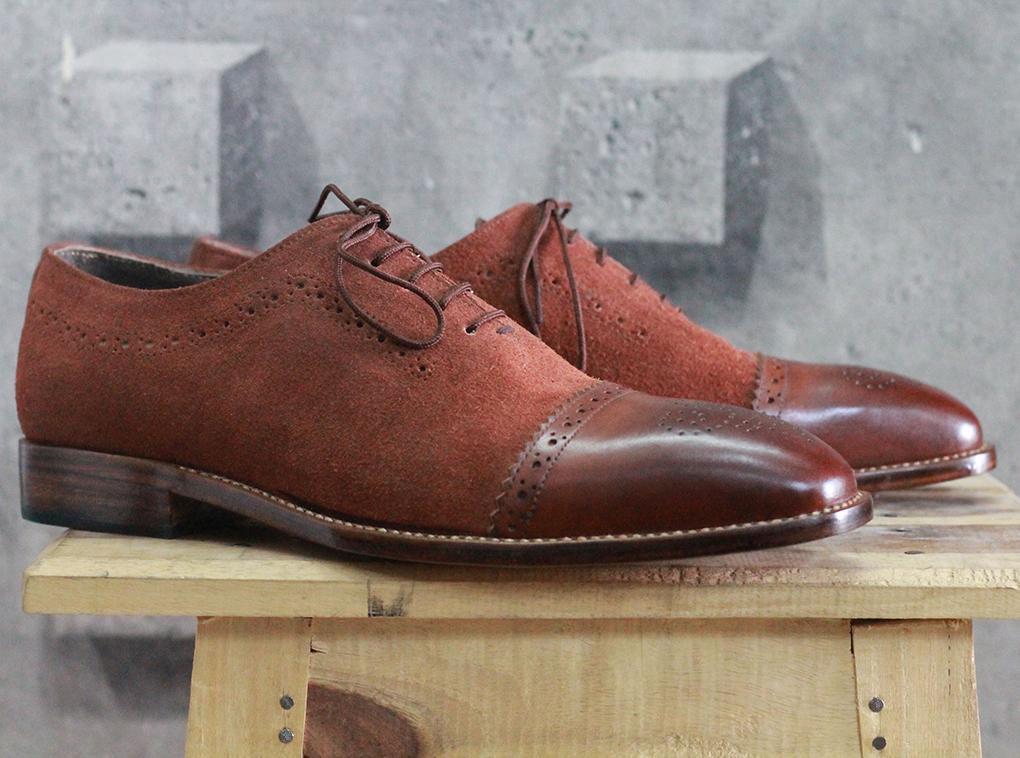 Men's Handmade Brown Cap Toe Brogue Lace Up Leather Suede Shoes