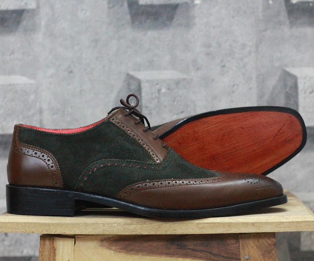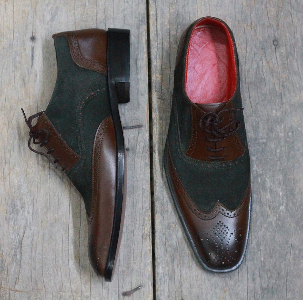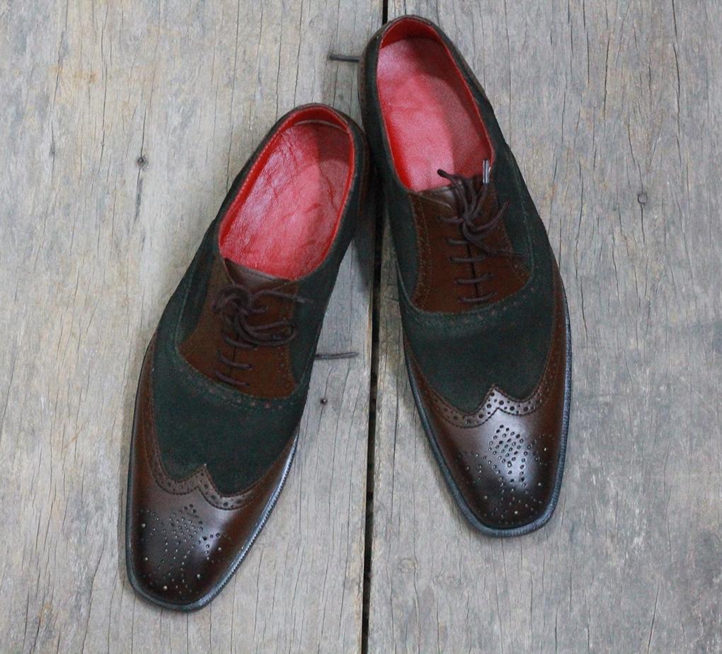 Men's Handmade Two Tone Wing Tip Brogue Lace Up Leather Suede Shoes