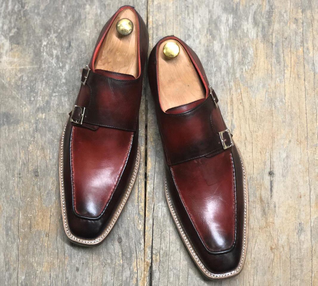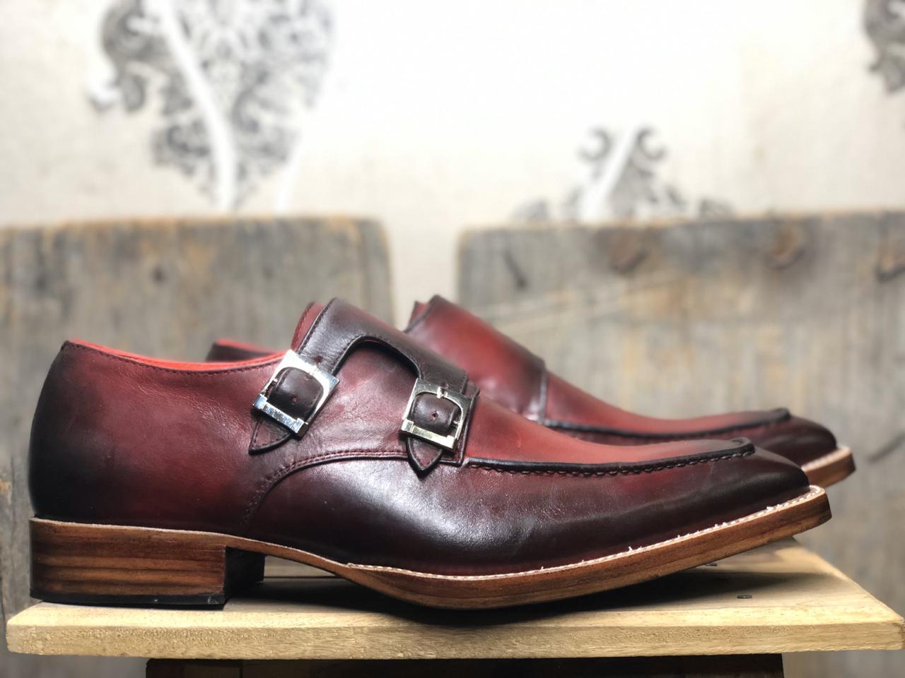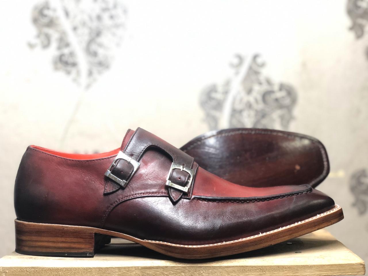 Men's Handmade Burgundy Leather Double Monk Shoes