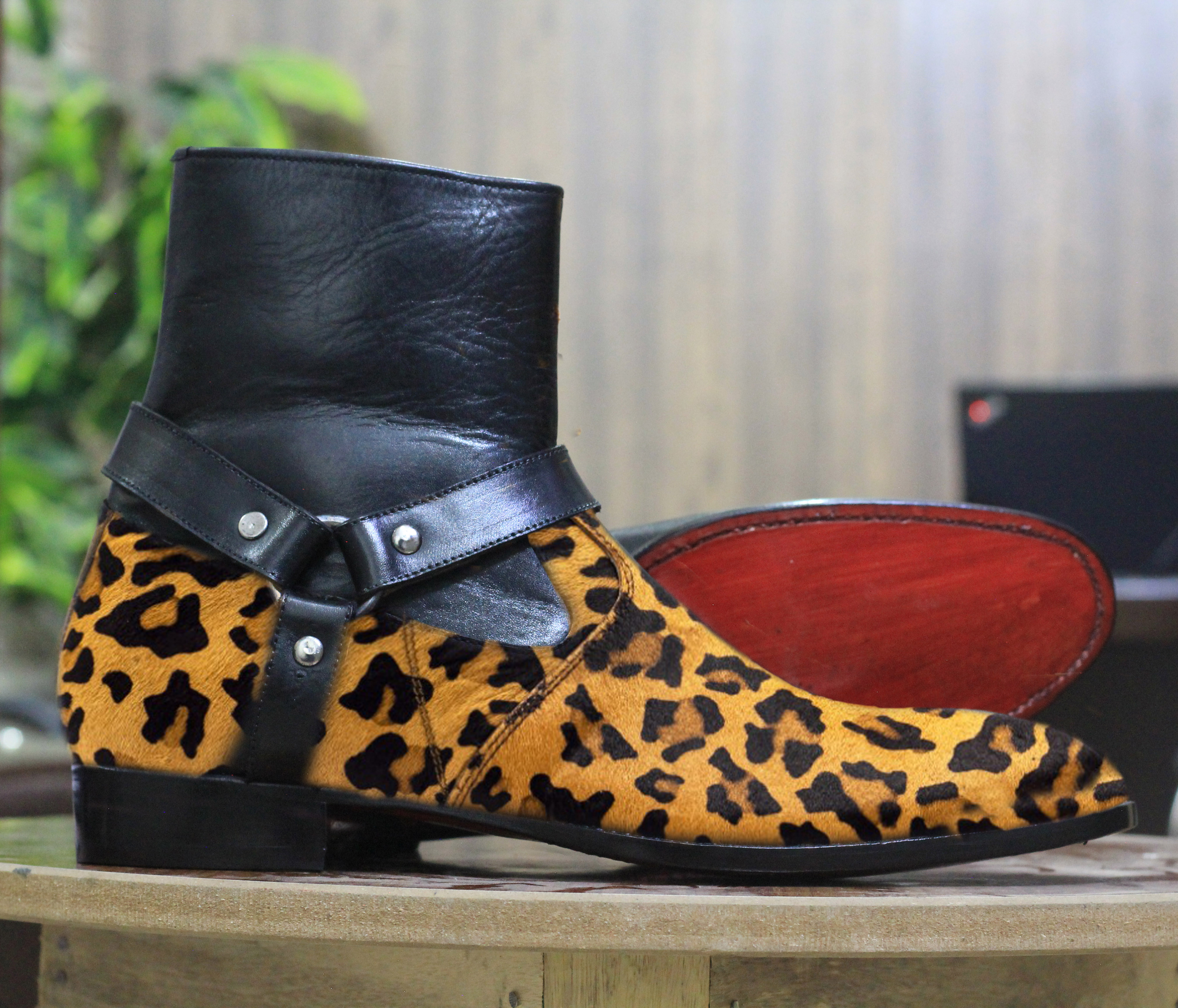 Elegent Madrid Strap Leather ankle Boot, Leopard Skin Print Leather Harness Boot