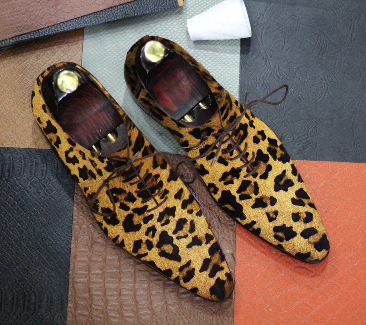 Men's Pointed Toe Leopard Skin Print Leather Handmade Lace Up Shoes