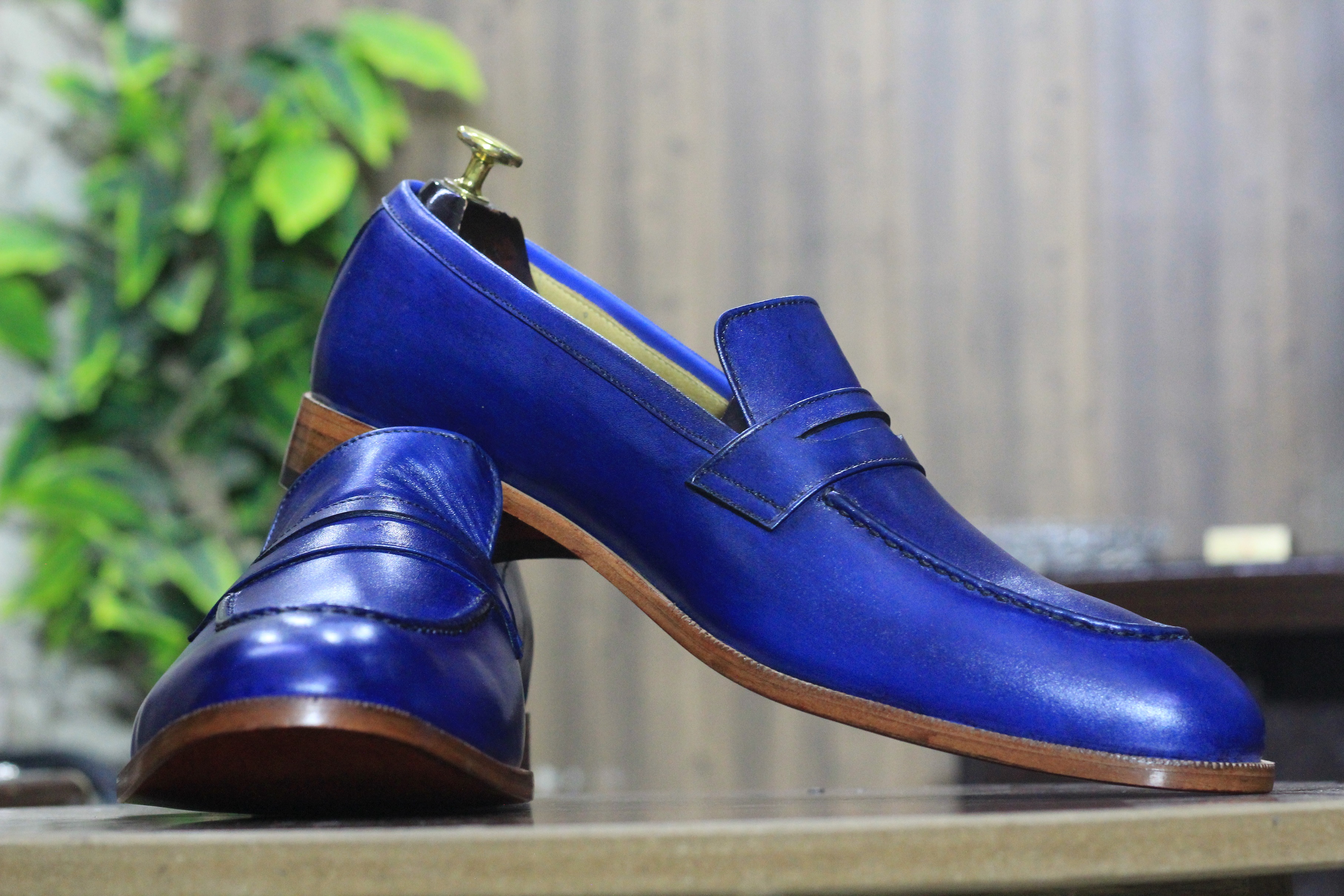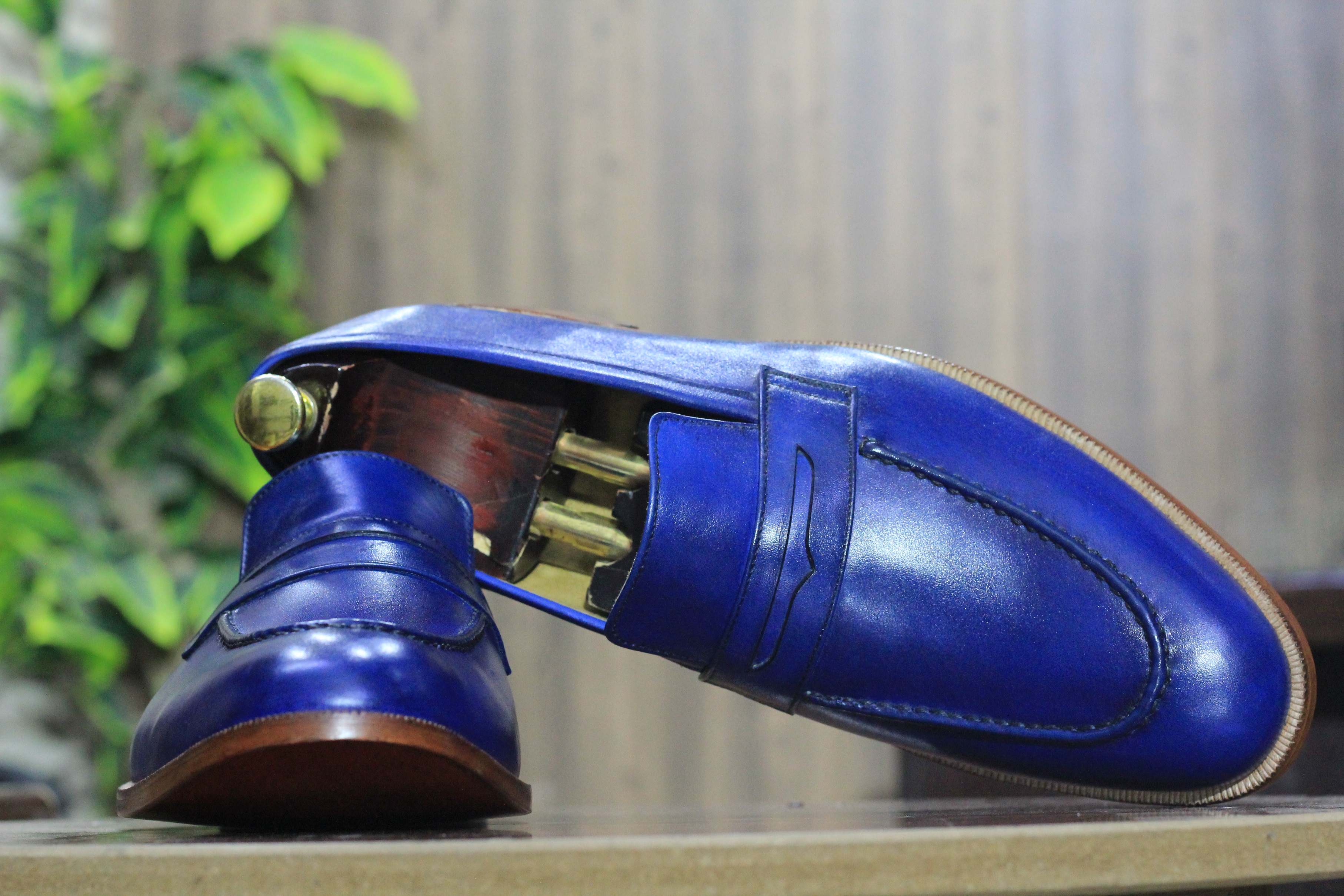 Handmade Apron Toe Blue Penny Leather Loafer Shoes For Men