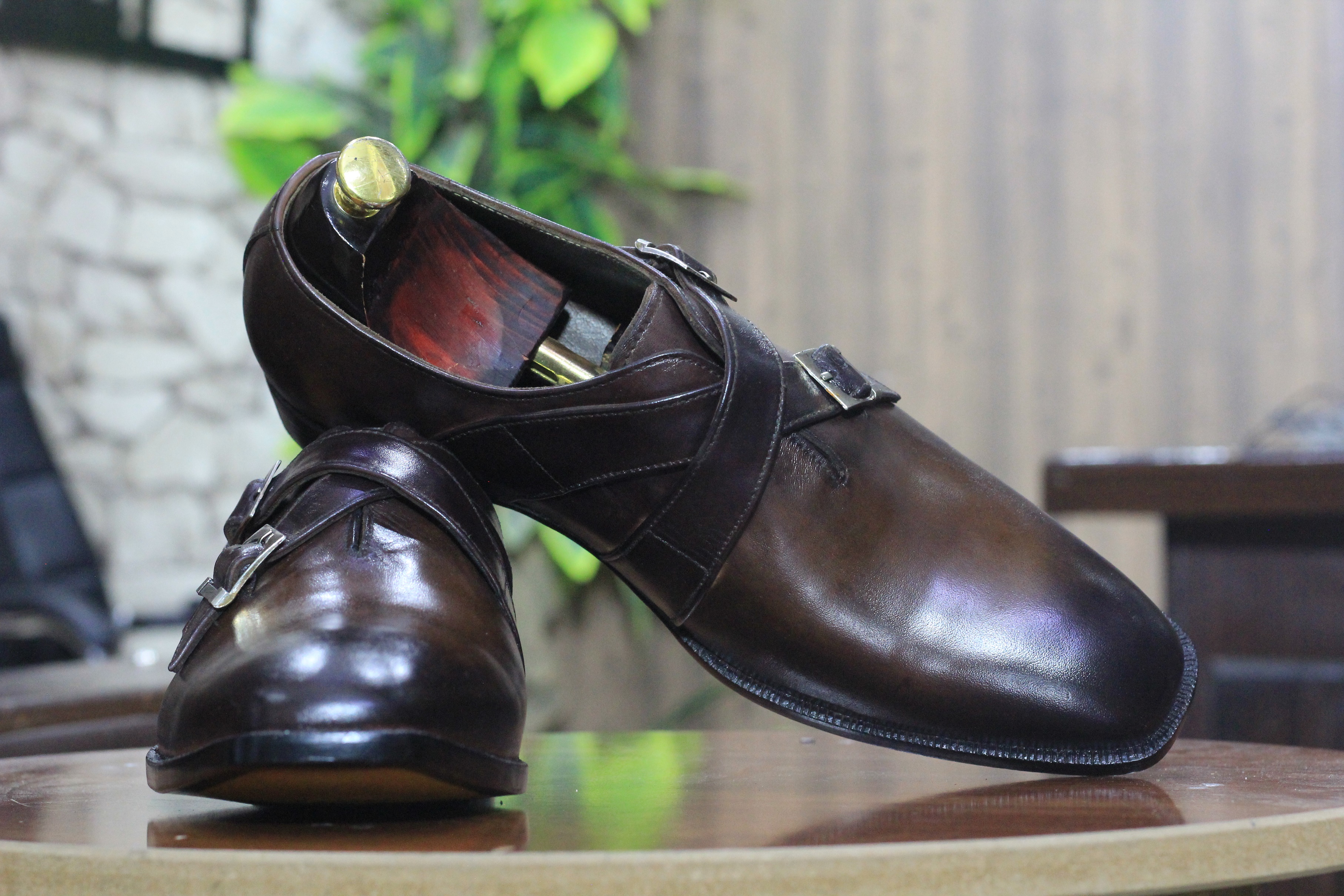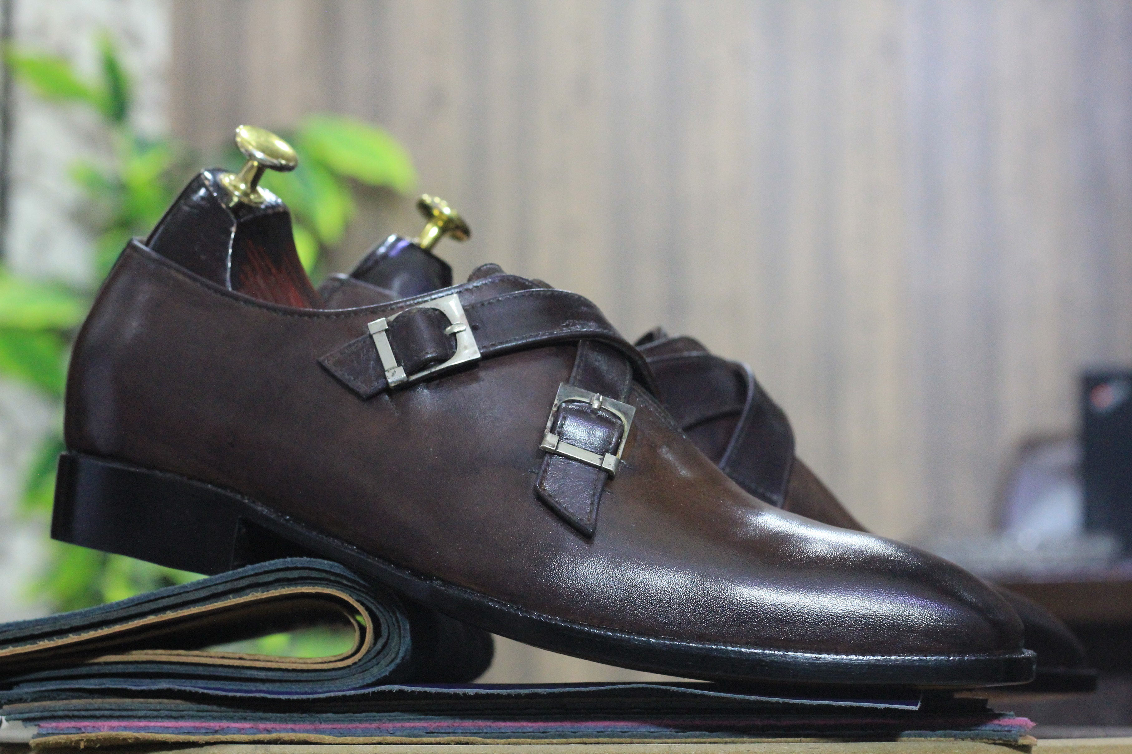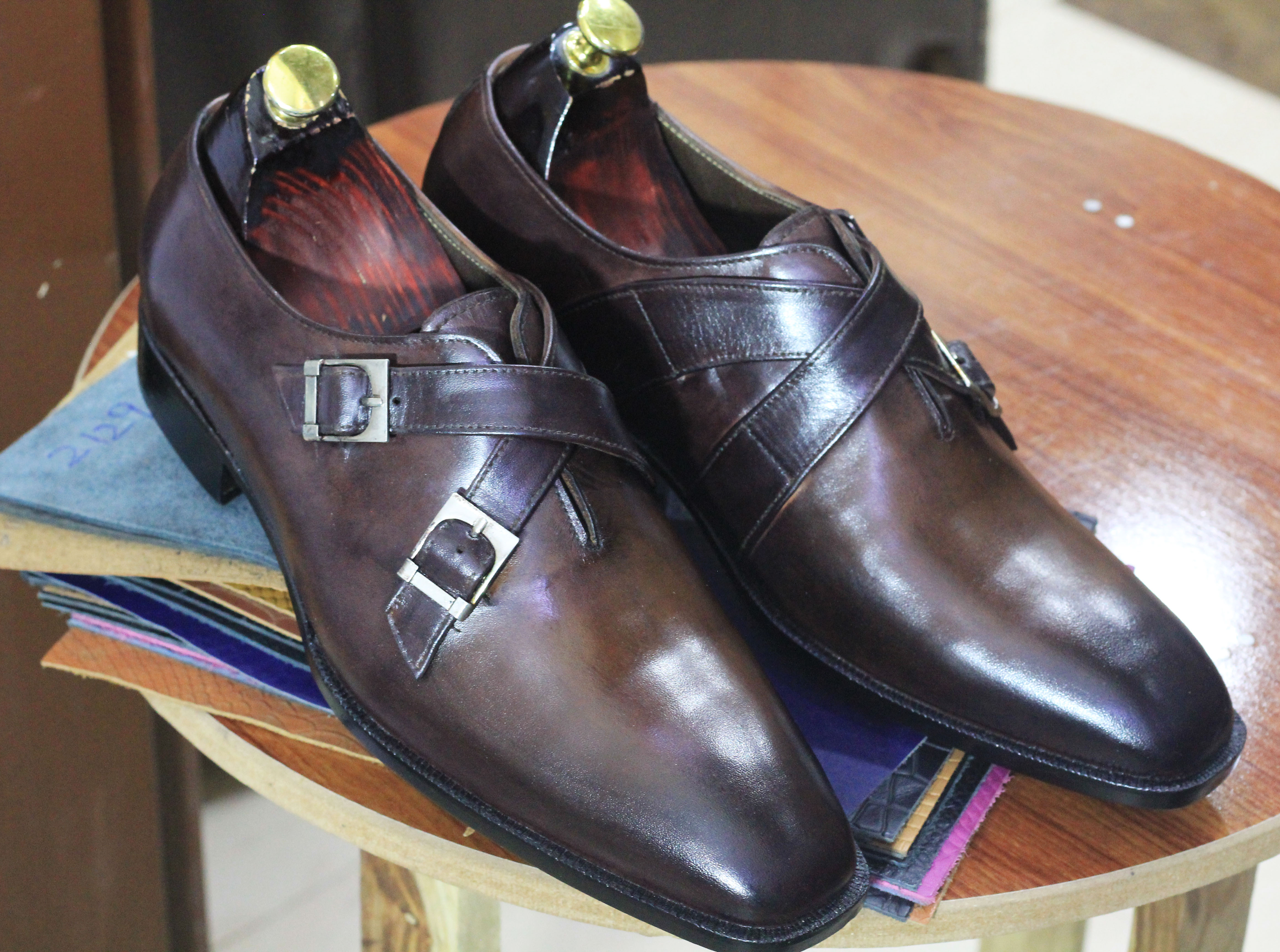 Hand Painted Brown Criss Cross Monk Straps Leather Shoes For Men