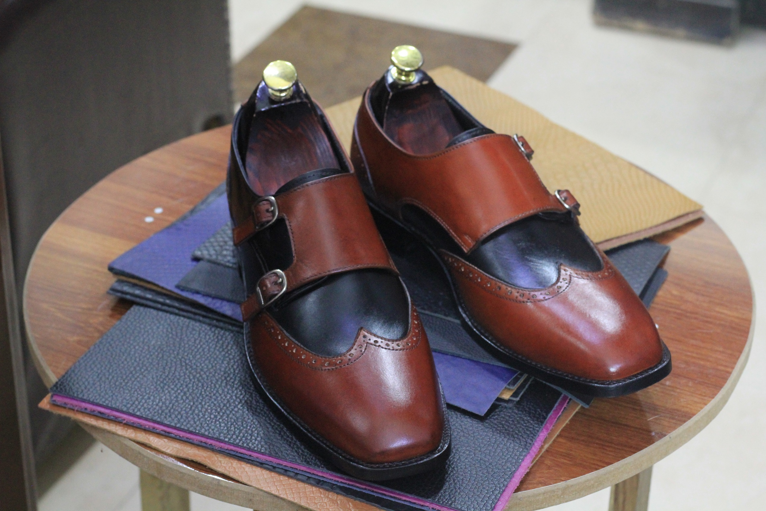 Men's Handmade Two Tone Double Monk Wing tip Leather Shoes