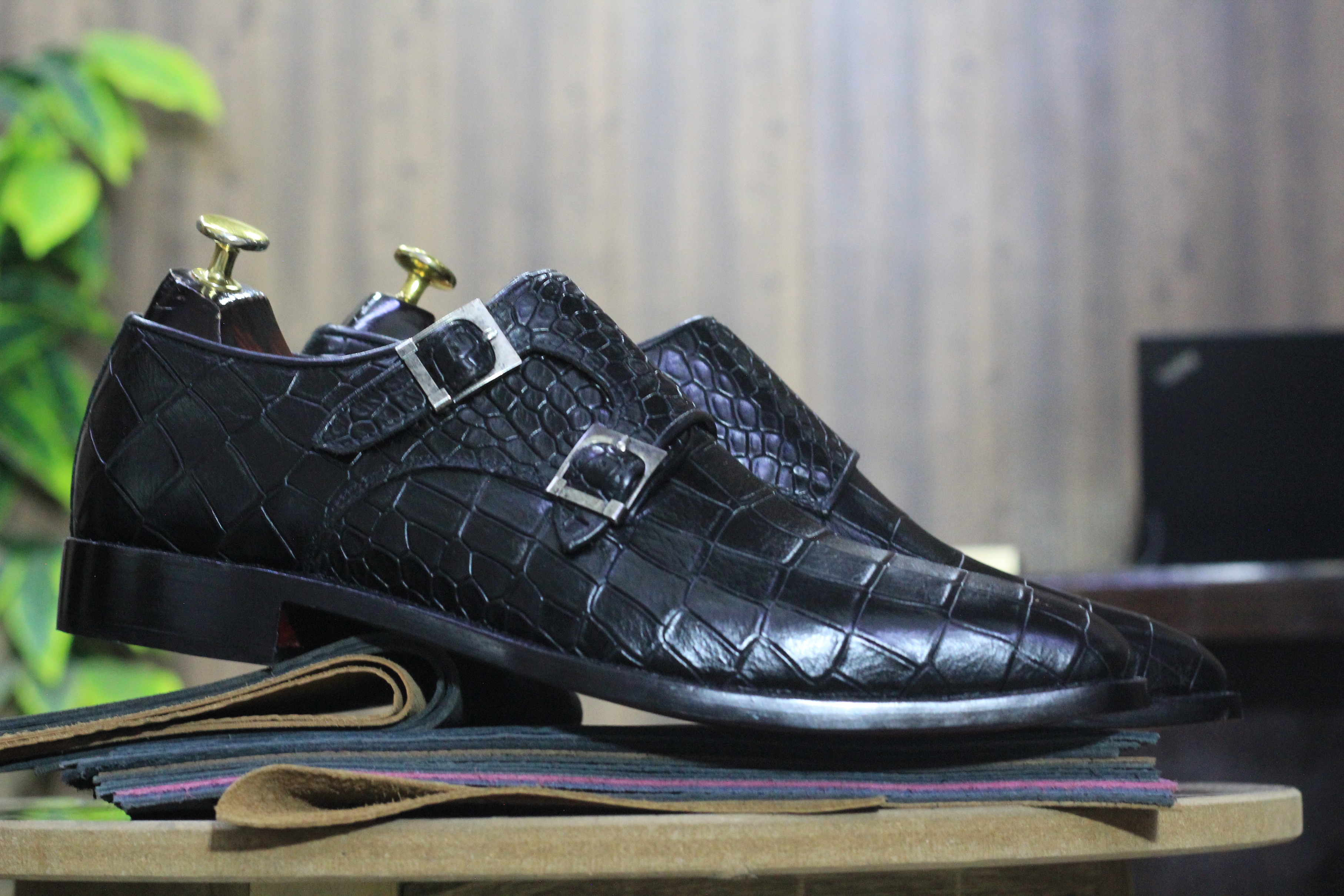 Handmade Pure Black Double Monk Alligator Skin Texture Leather Shoes