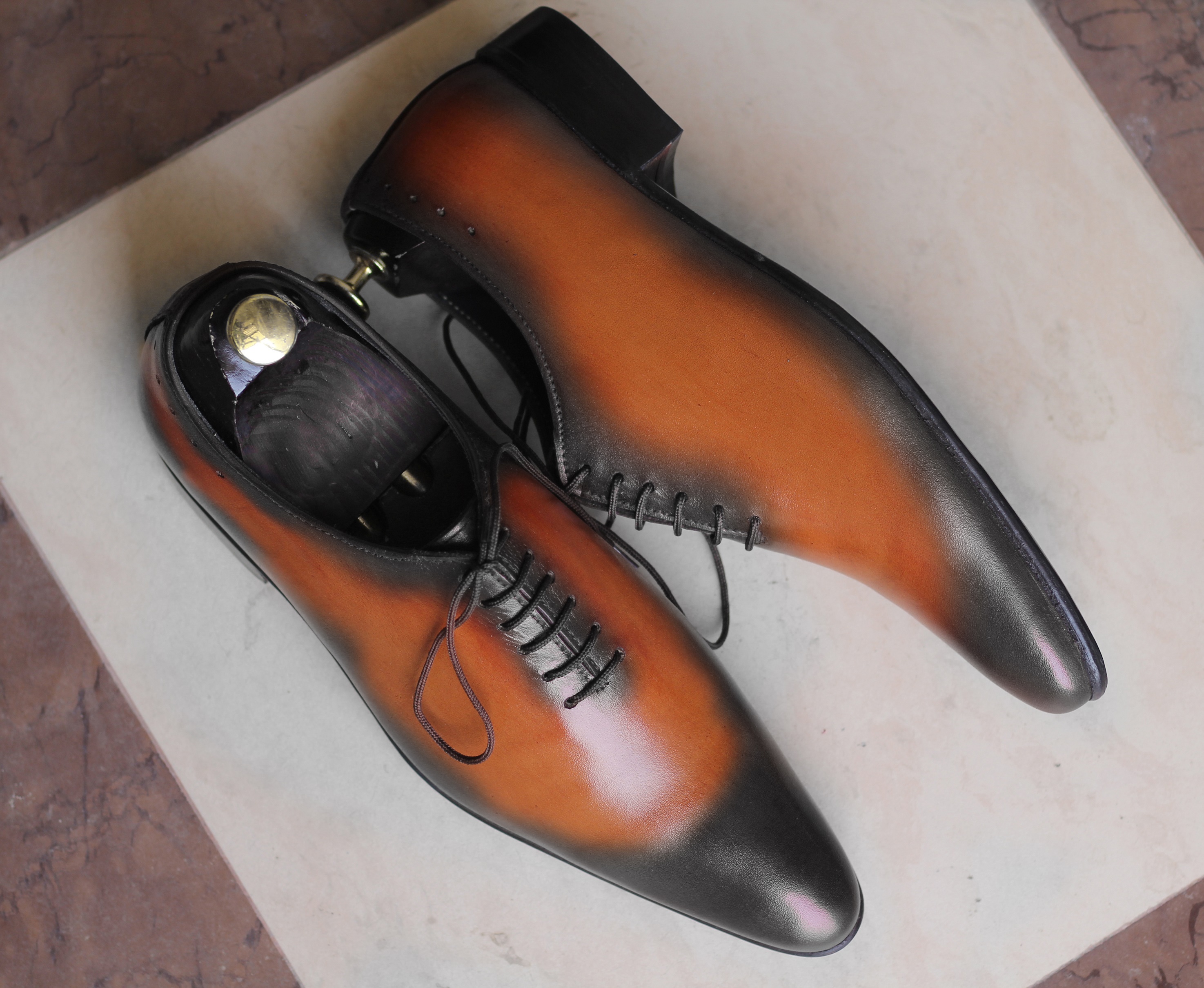 Hand Painted Two Tone Pointed Toe Leather Lace Up Whole Cut Shoes
