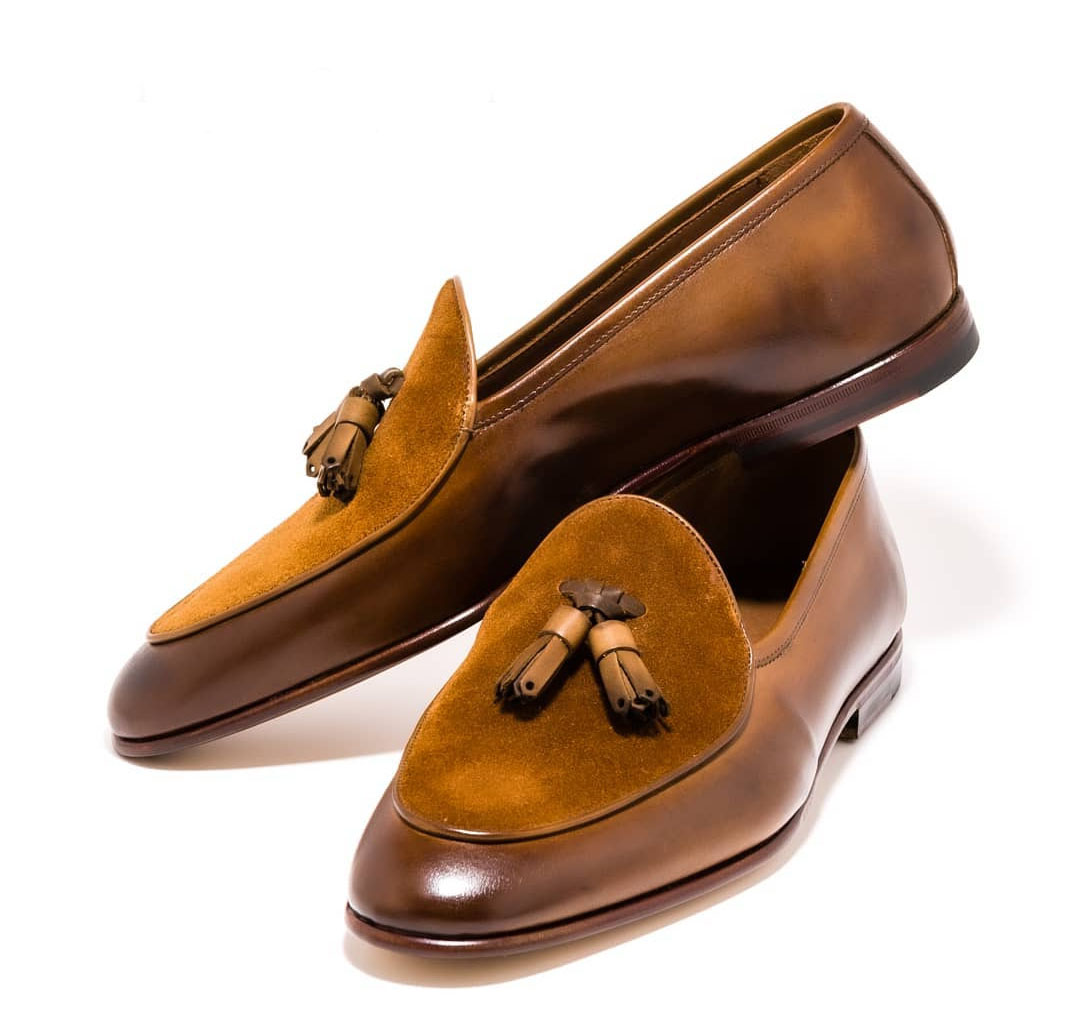 Hand Crafted Apron Toe Tan Brown Tasselled Slip On Velevt & Leather Loafer