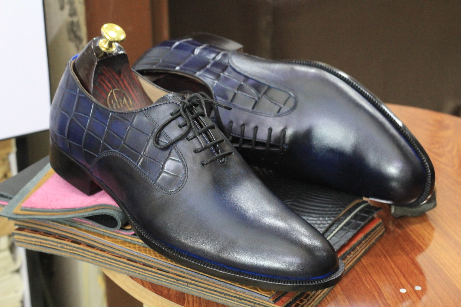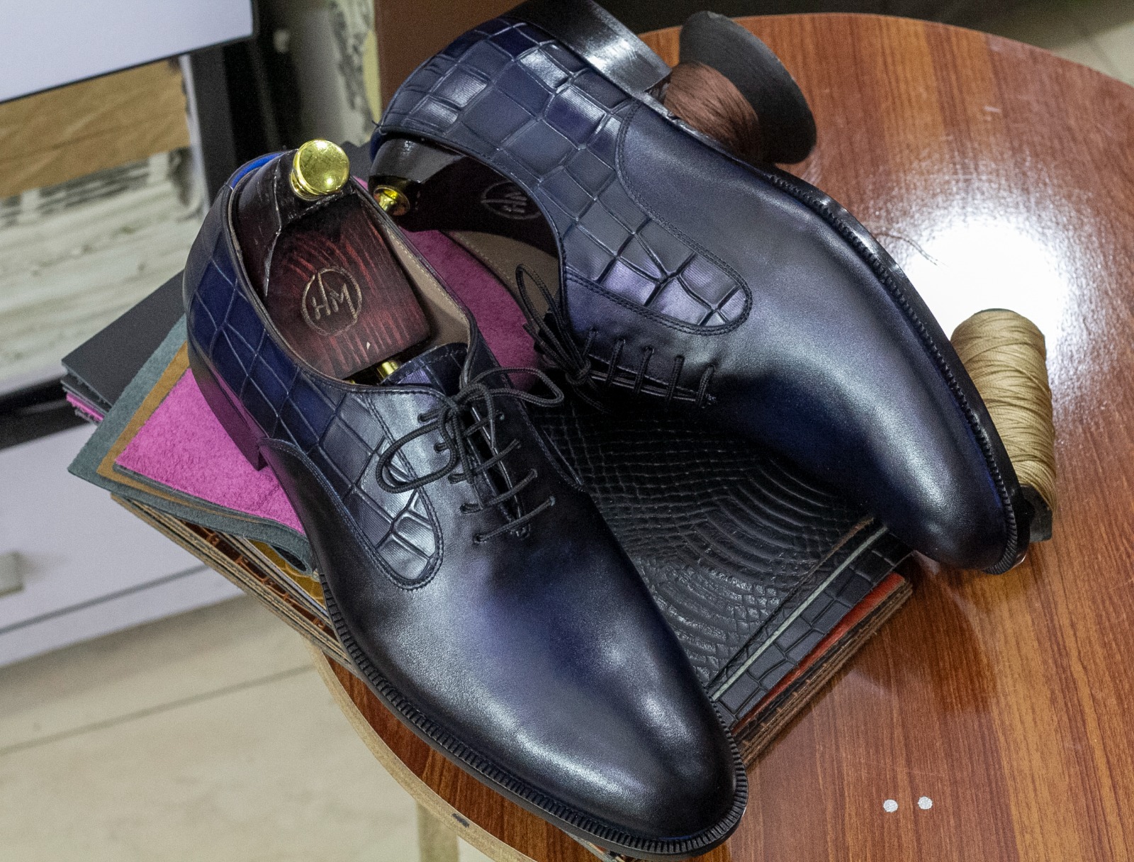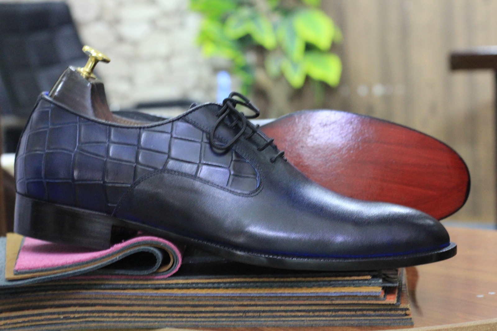 Men's Bespoke Handmade Two Shaded Color Alligator and Plane Leather Lace Up Style Designer Shoes