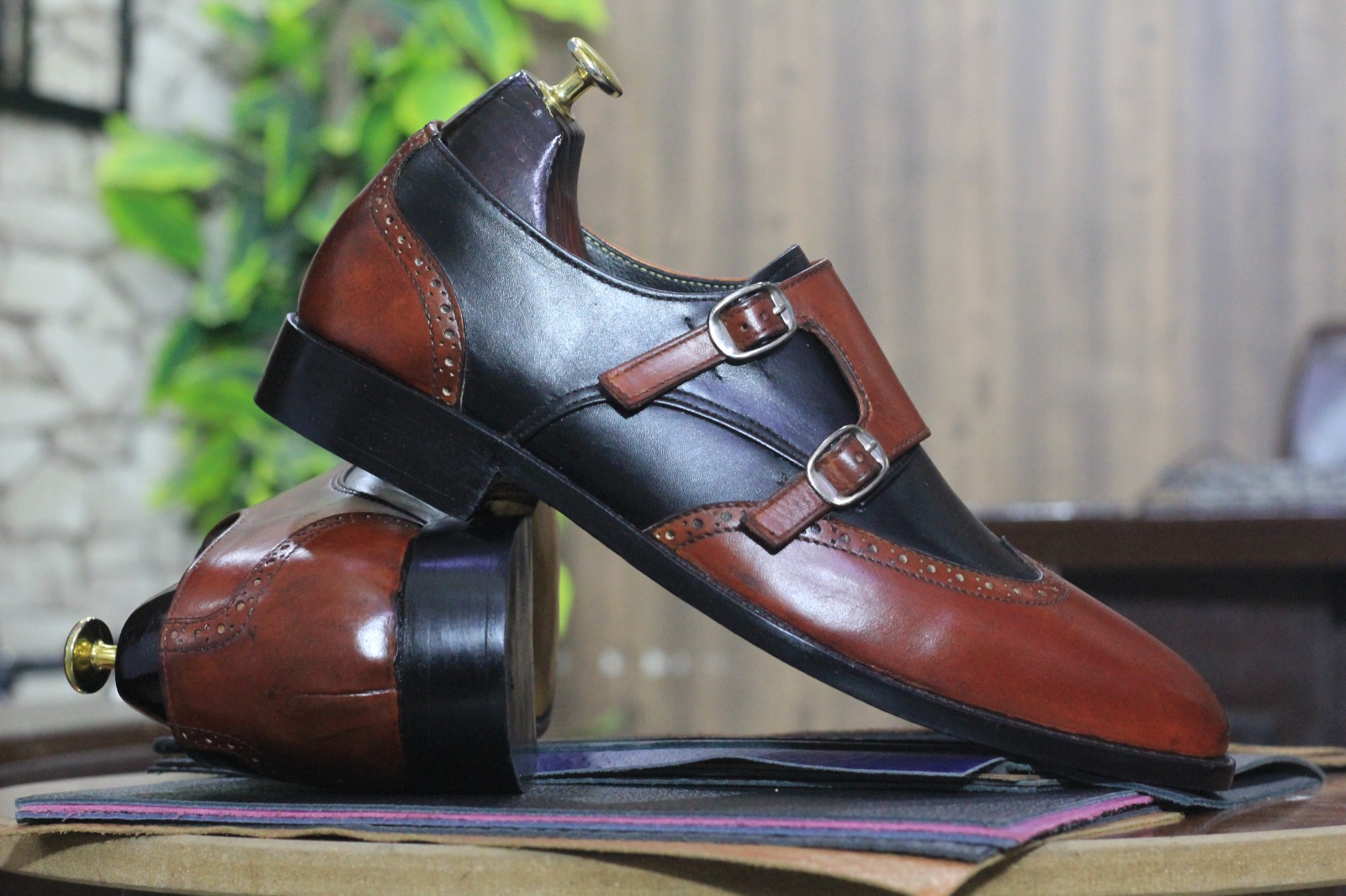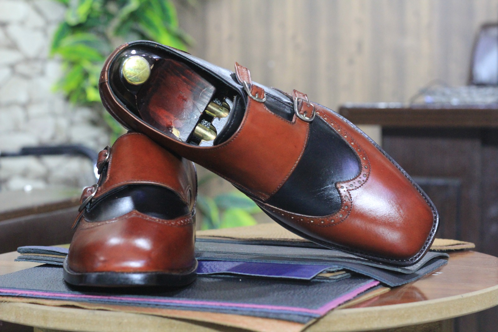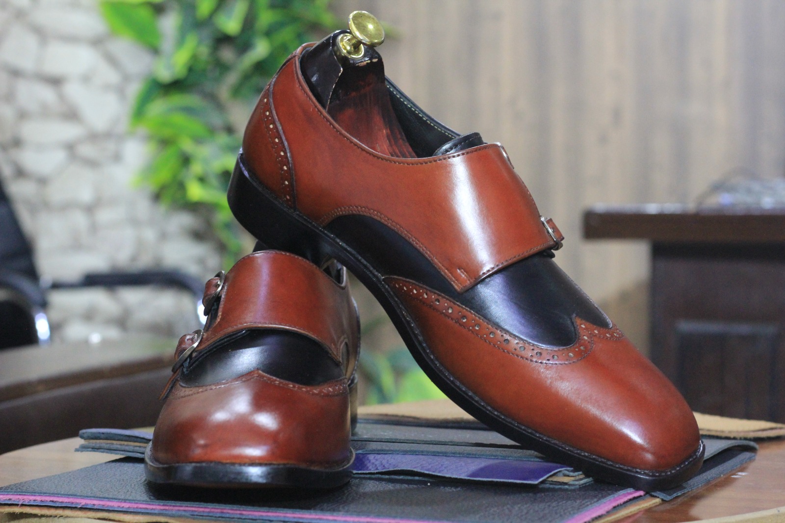 Handmade Two Tone Color Double Buckle Wing Tip Style Genuine Leather Shoes for Men's