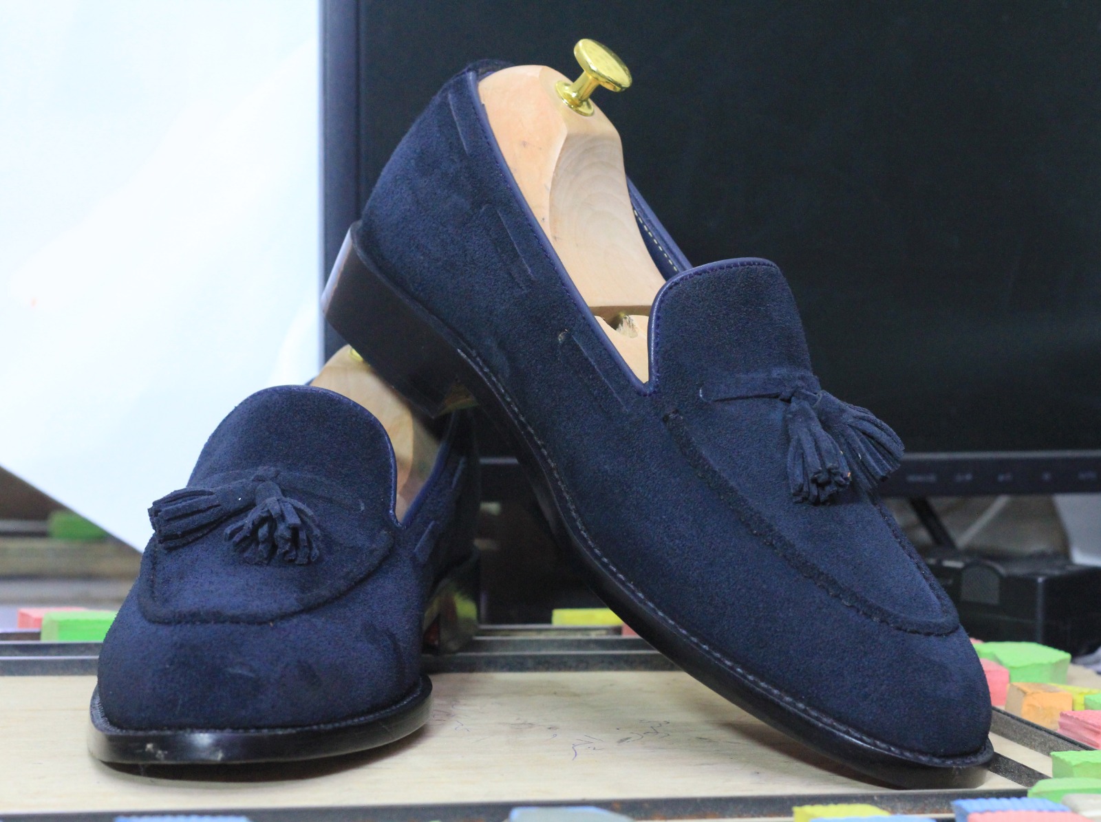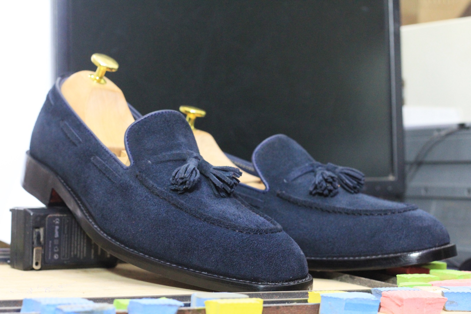 Men's Handmade Blue Color Tussle Loafer Style Slip On Moccasin Suede Shoes