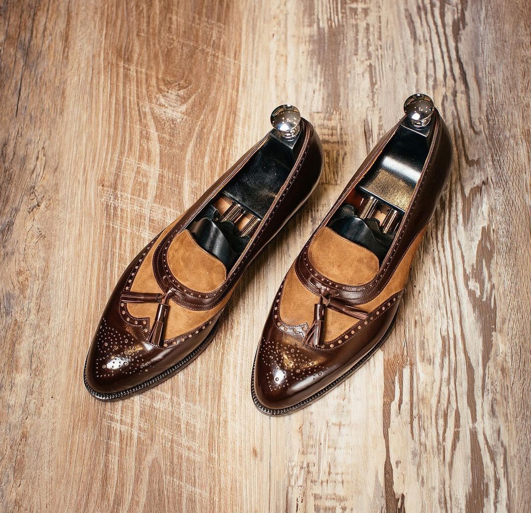 Bespoke Handmade Brown Color Leather Suede Wing Tip Brogue Toe Style Tussle Loafer Men's Stylish Shoes
