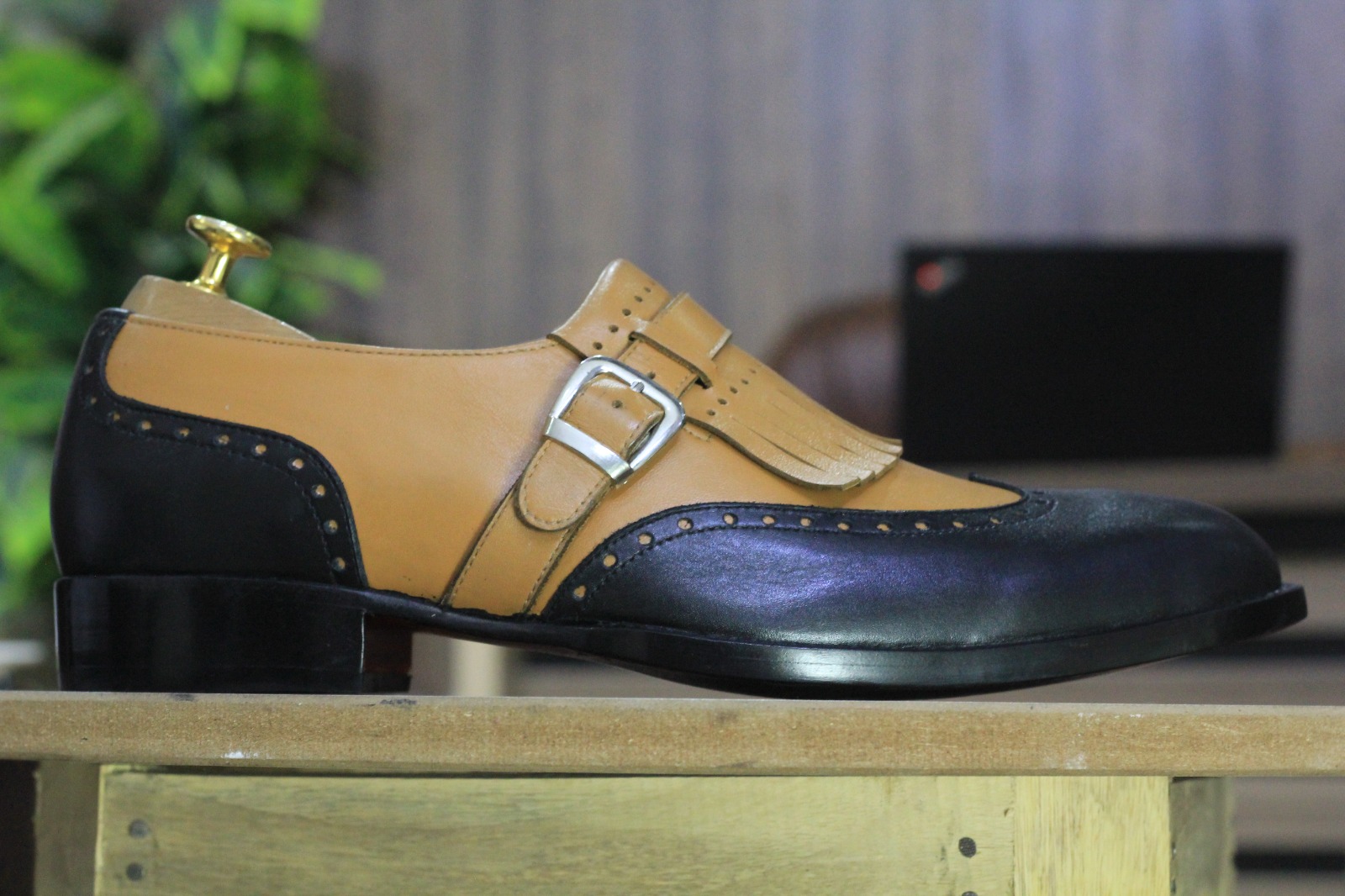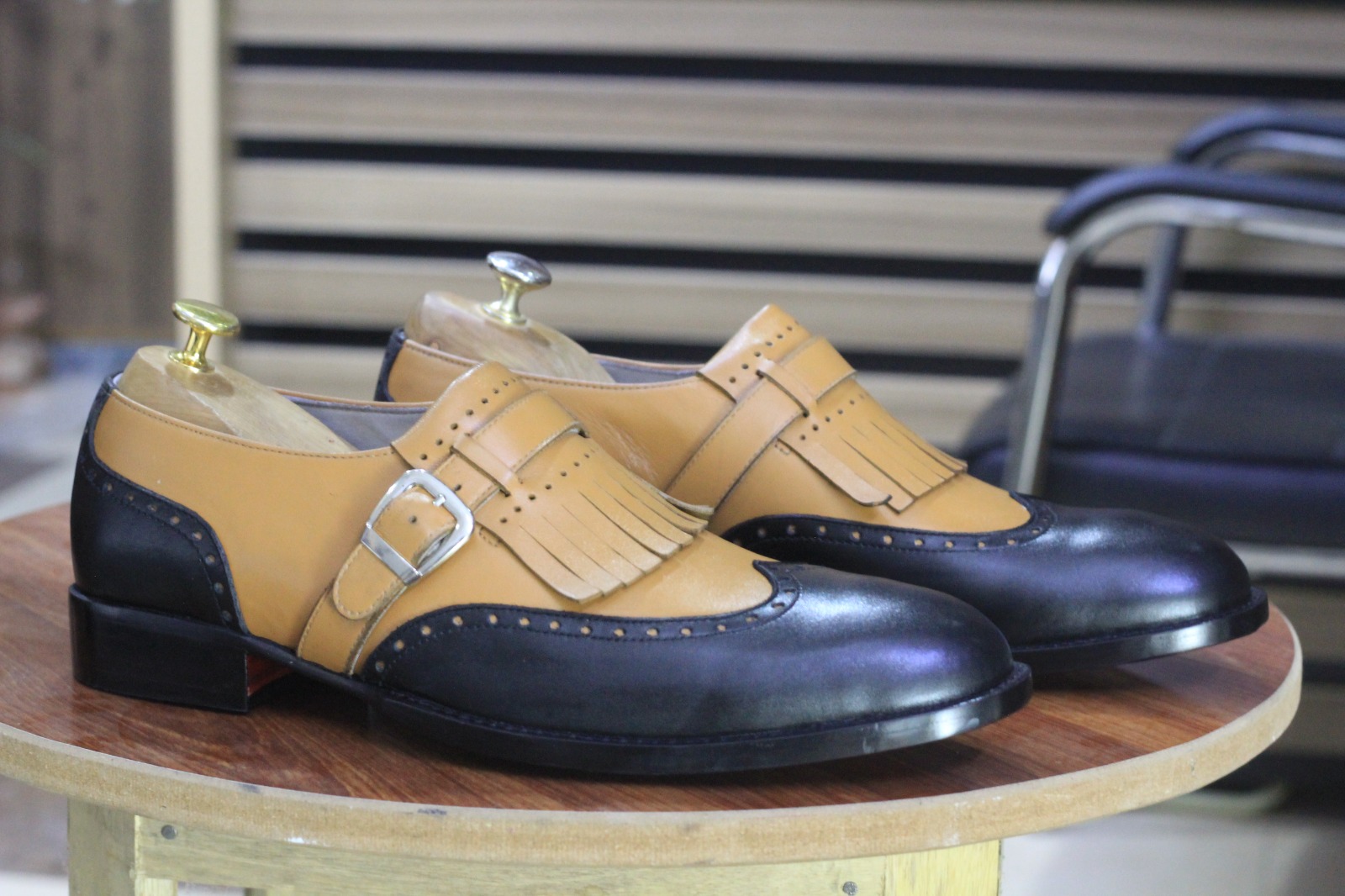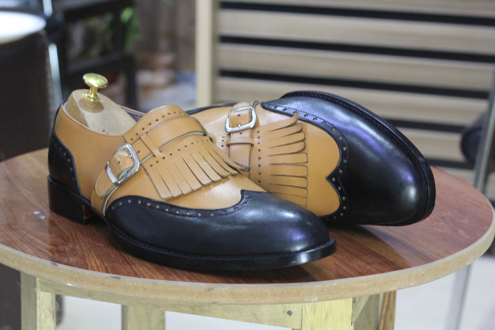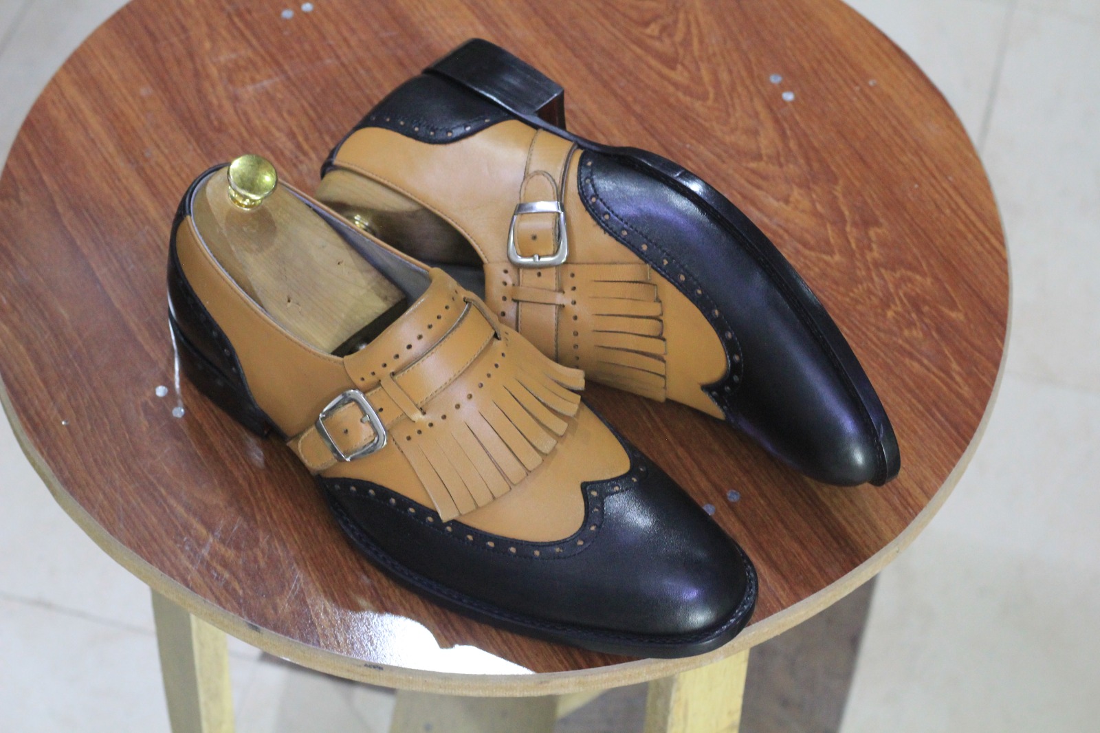 Bespoke Handmade Two Tone Color Fringe Buckle Wing Tip Style Leather Loafer Shoes