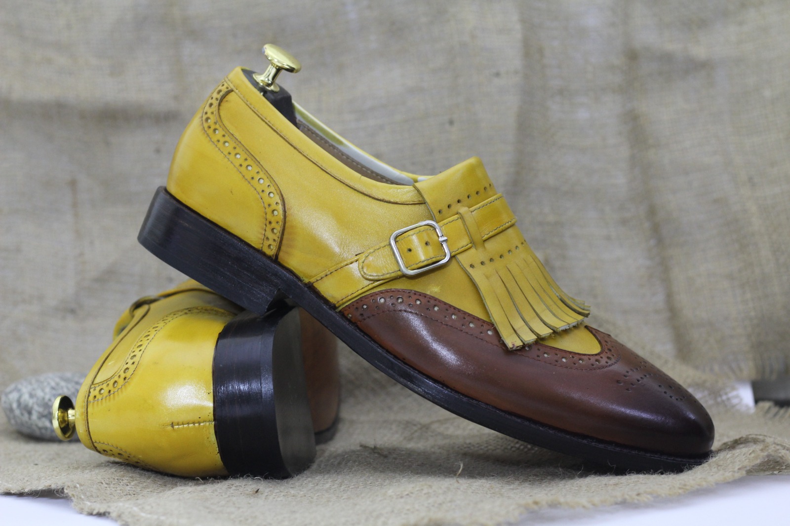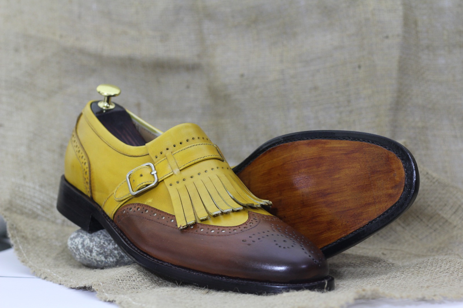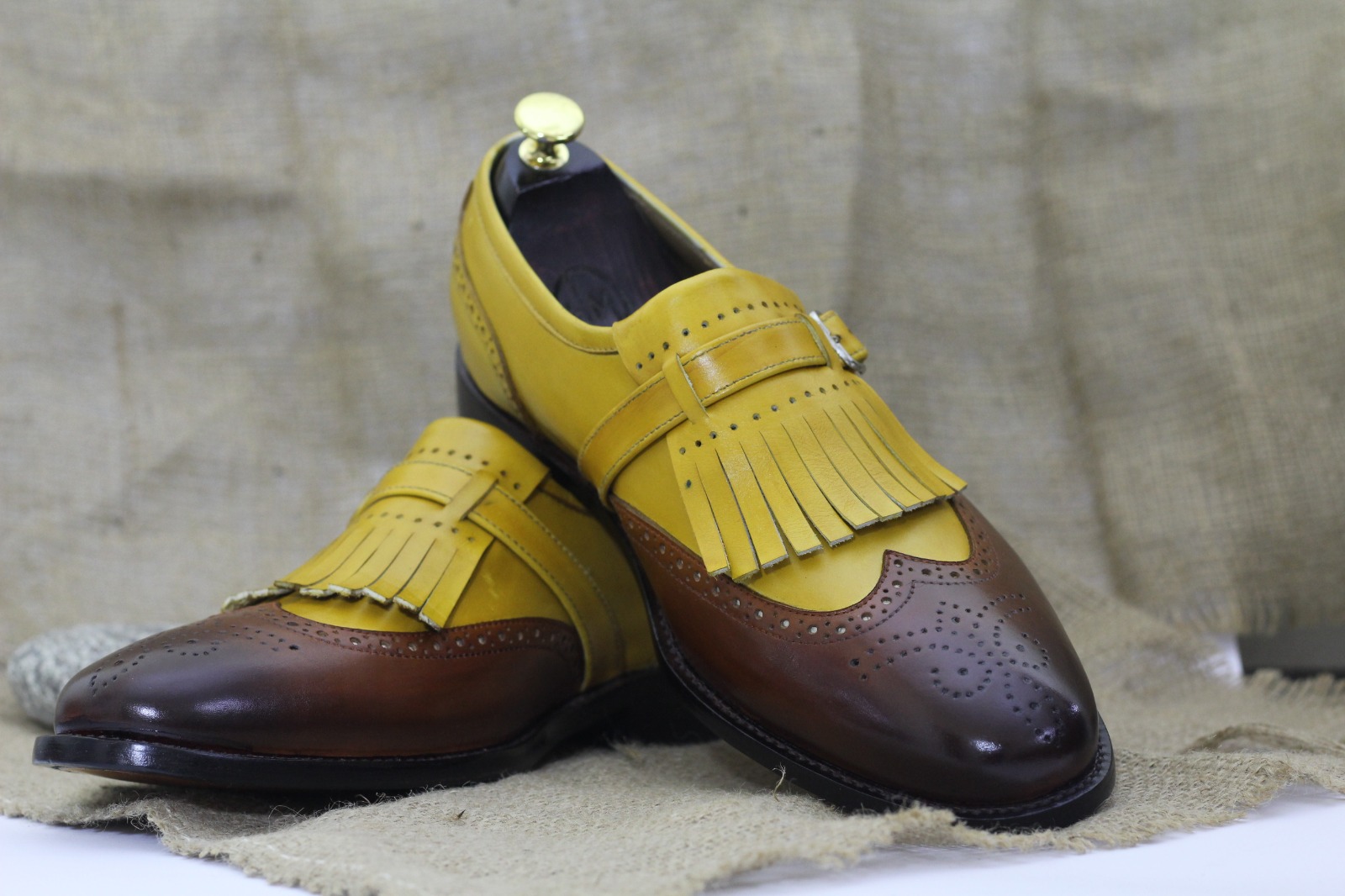 Yellow and Brown Color Fringe Buckle Wing Tip Brogue Toe Style Genuine Leather Handmade Shoes for Men's