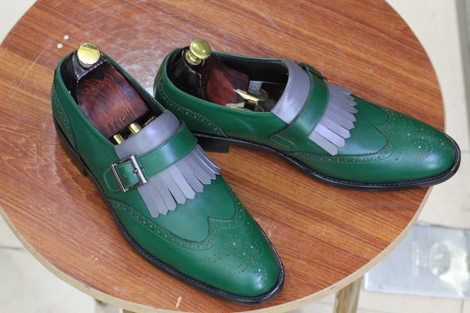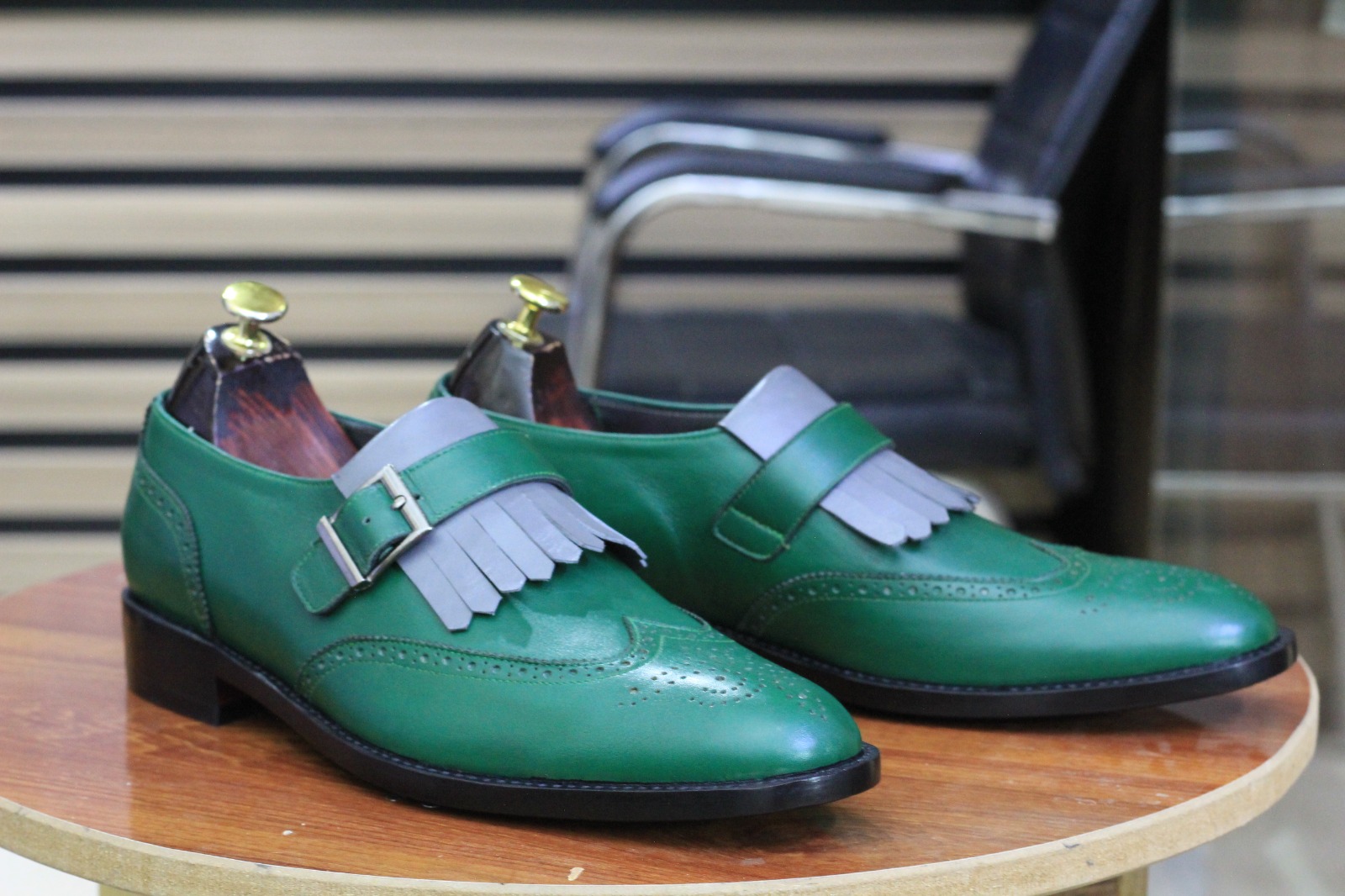 Two Tone Color Fringe Buckle Style Wing Tip Brogue Toe Loafer Genuine Handmade Leather Men's Shoes