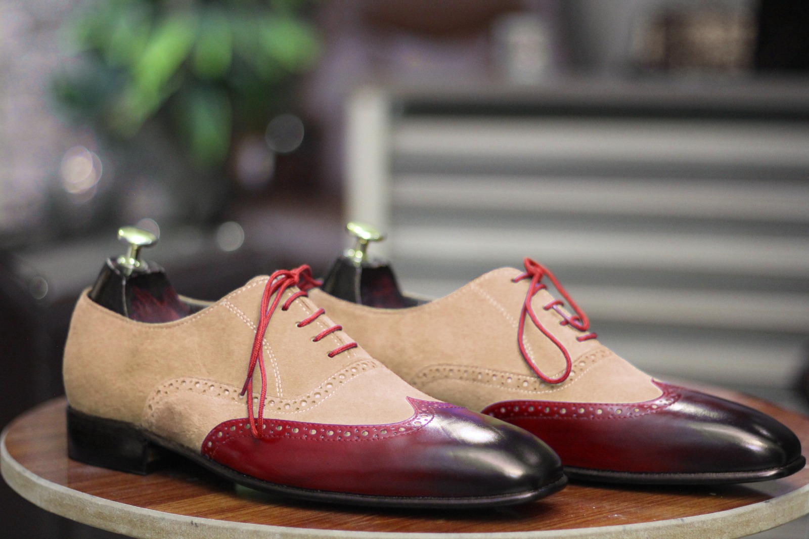 Camel and Burgundy Color Wing Tip Lace Up Leather Suede Gentlemen Luxury Shoes