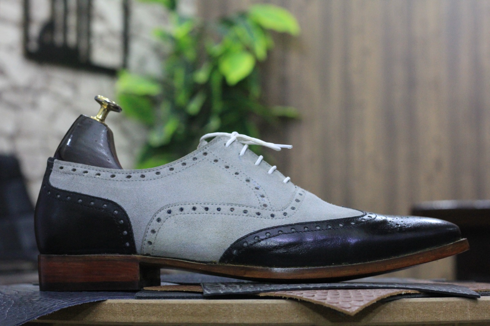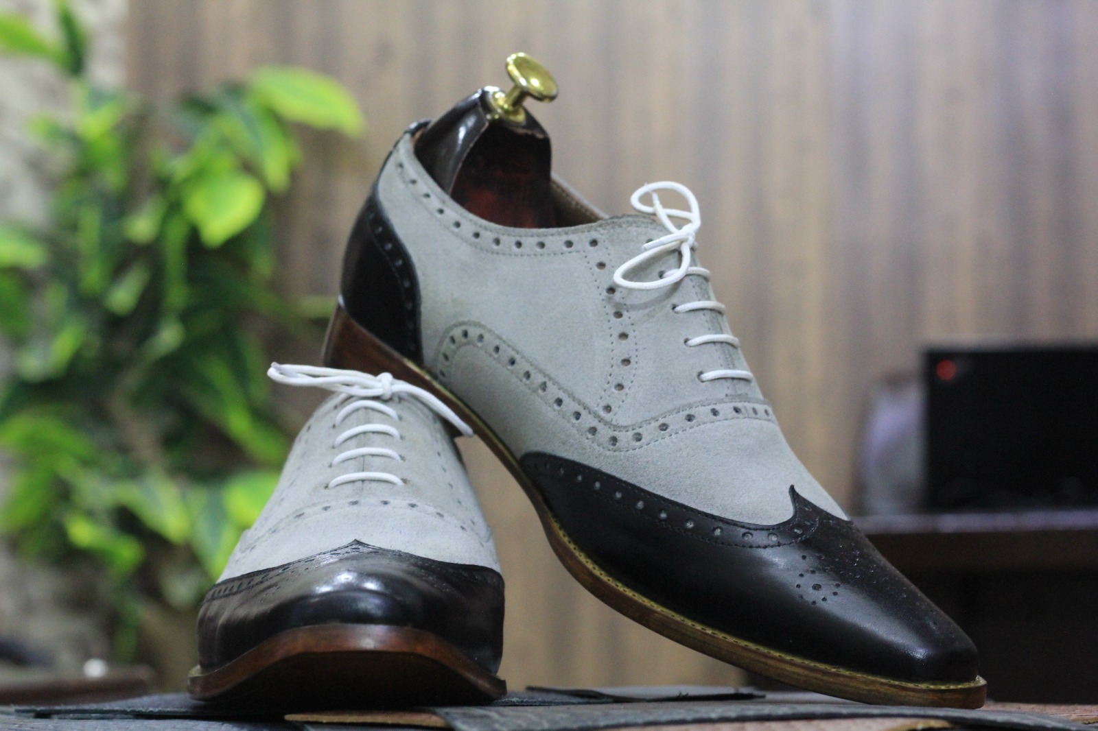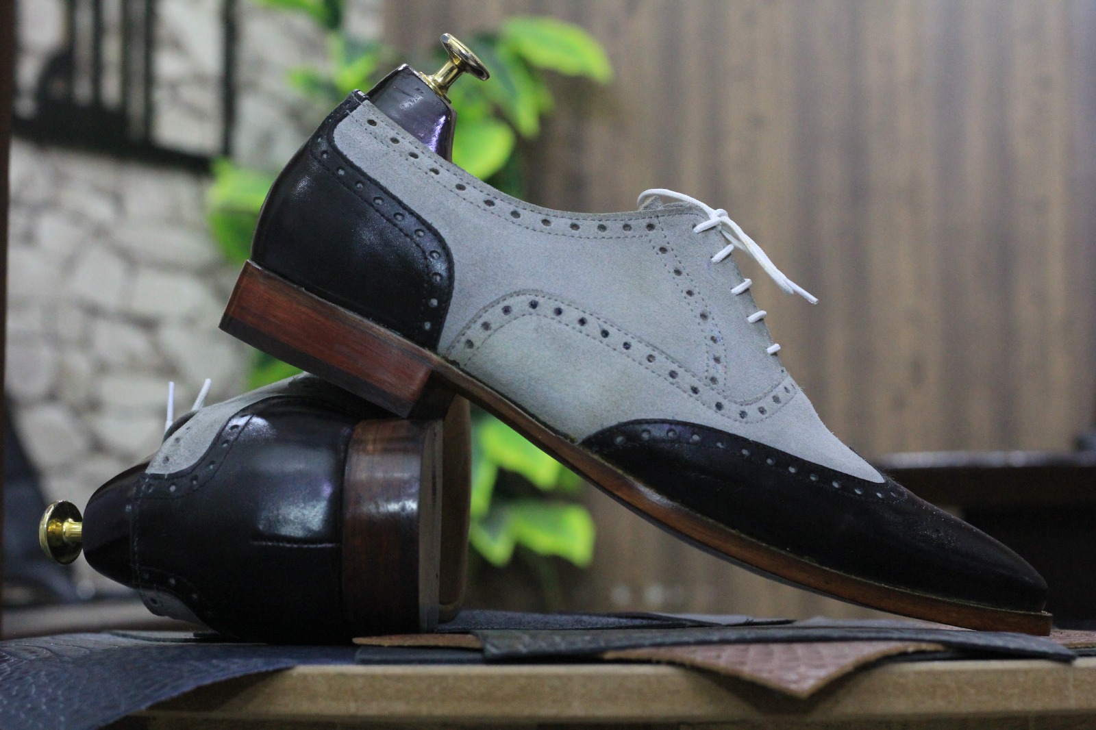 Bespoke Handmade Grey Black Color Leather Wing Tip Lace Up Men's Brogue Toe Style Classic Shoes