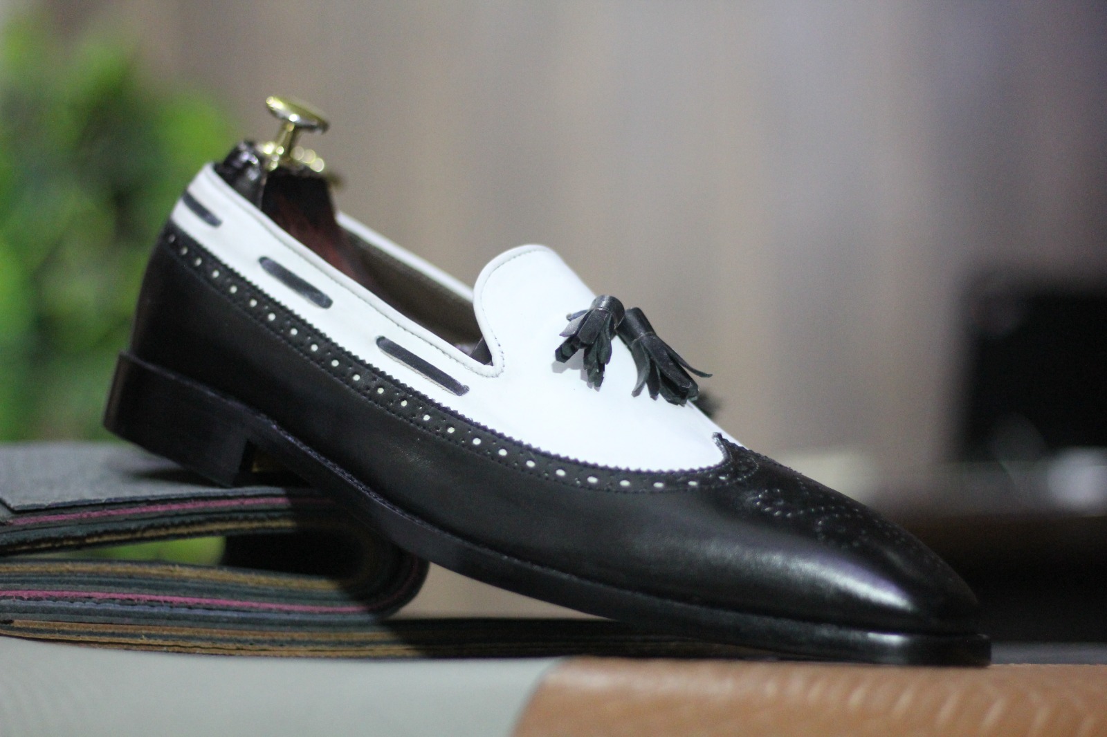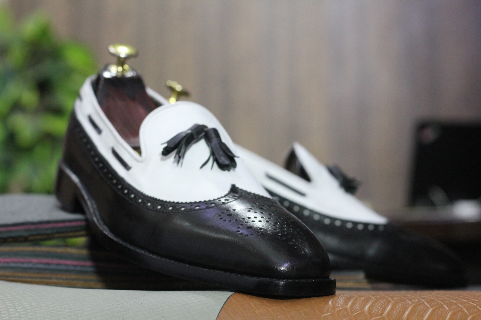 Men's Handmade Wing Tip Brogue Toe and Tussle Loafer Style Black and White Color Genuine Leather Shoes