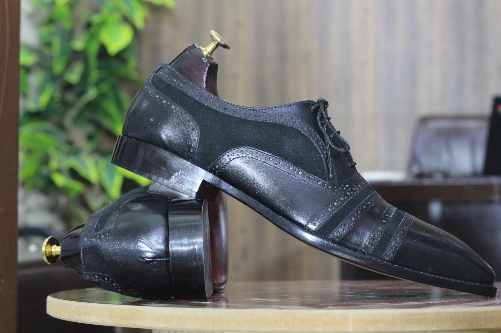 Men's Handmade Black Color Leather Suede Cap Toe Lace Up Style Classic and Luxury Shoes