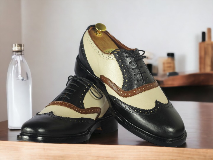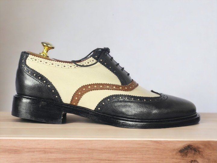 Tree tone Color Wing Tip Lace Up and Brogue Toe Style Men's Handmade Pure Leather Shoes