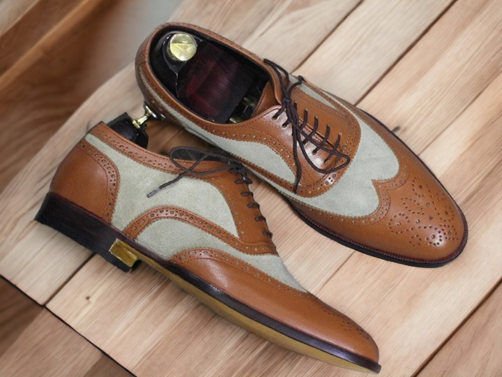 Handmade Two Tone Color Leather Suede Wing Tip Brogue Toe and Lace Up Style Men's Shoes