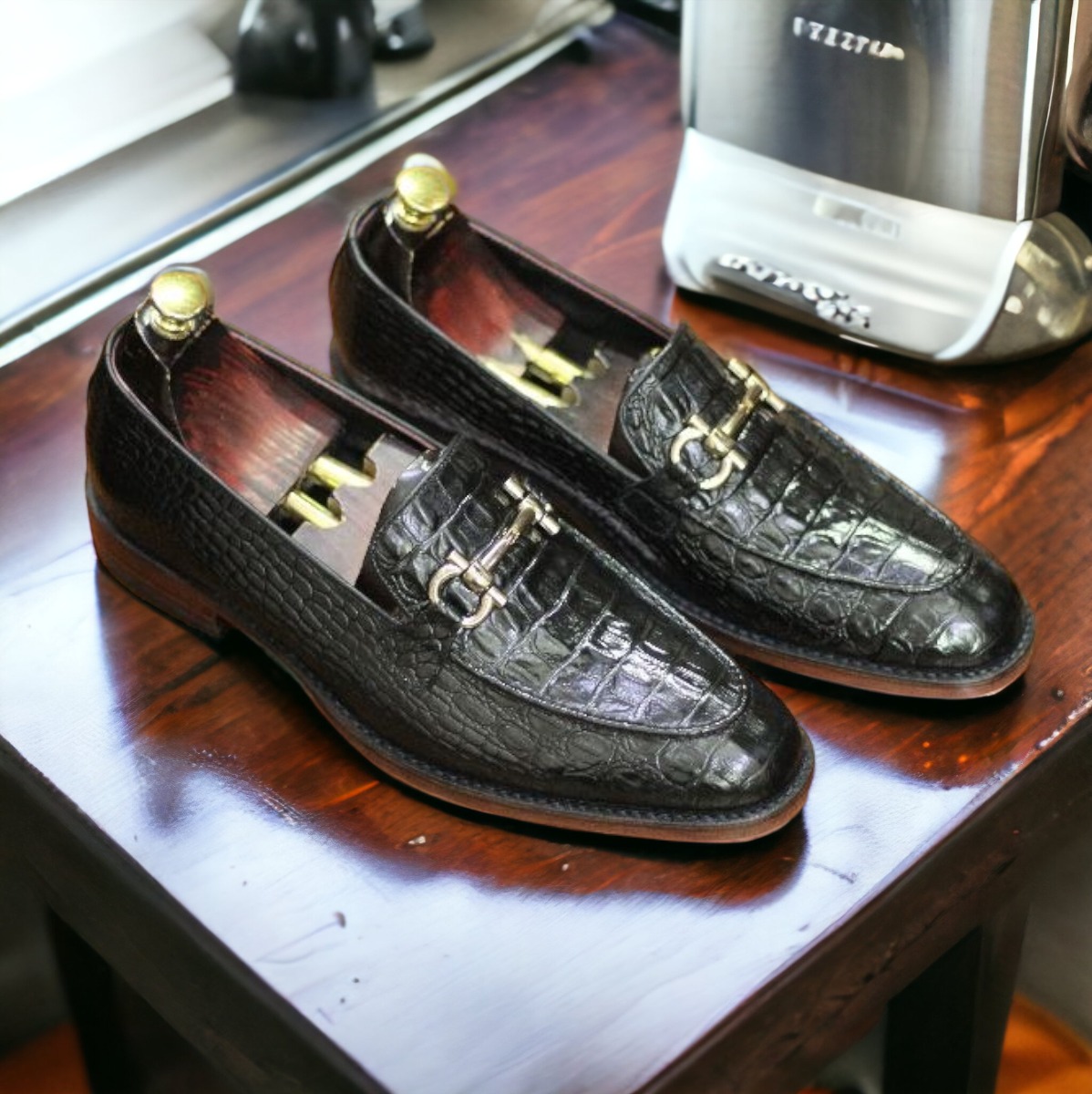 Handmade Black Color Horse Bit Style Crocodile Texture Leather Men's Classic Shoes