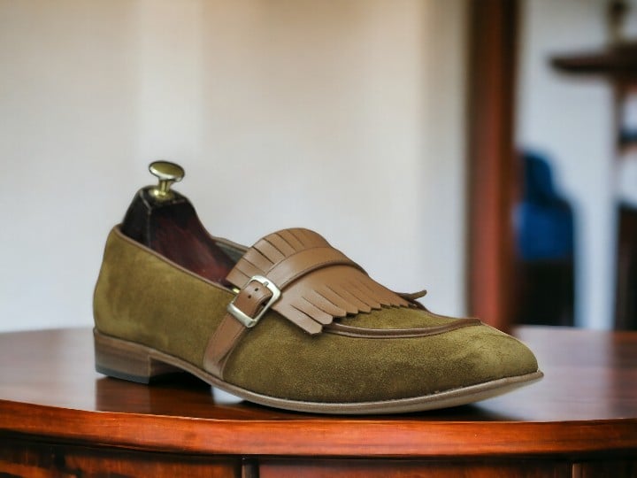 Handmade Men's Mustard Suede Shoes ,Fringe Buckle Loafer Shoes