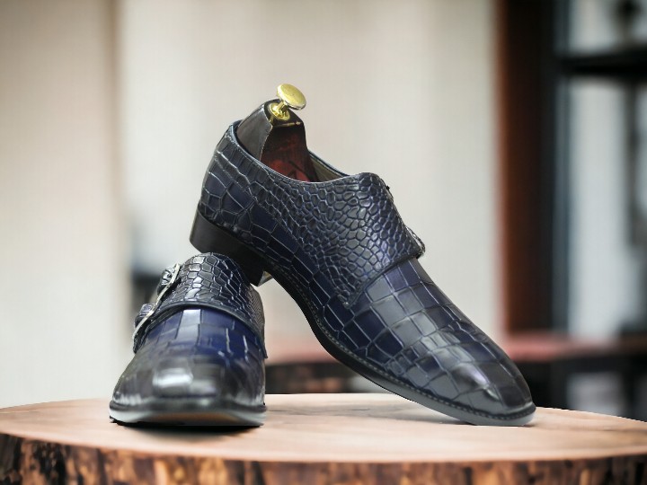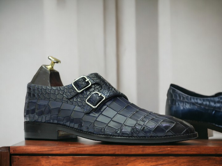 Handmade Men's Blue Leather Shoes ,Alligator Print Double Buckle Shoes