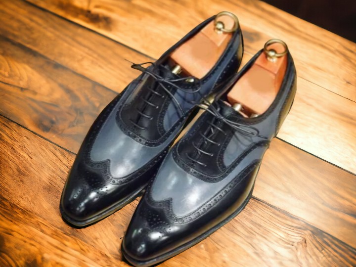 Handmade men's two tone wing tip Shoes ,black leather lace up dress shoes