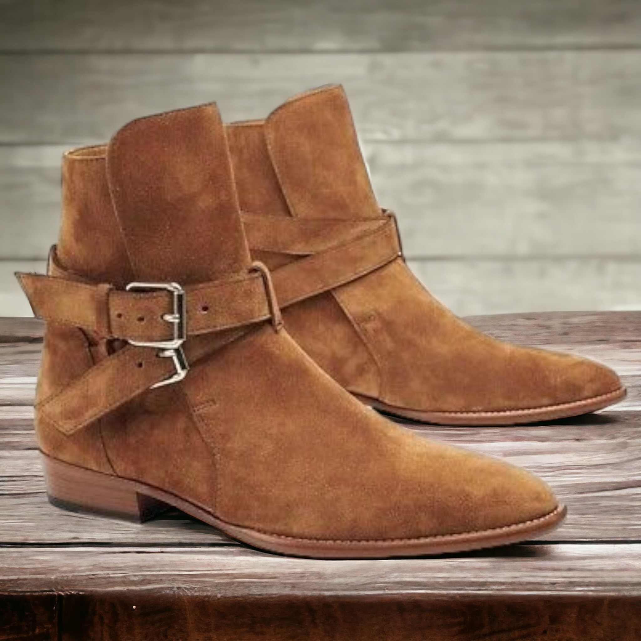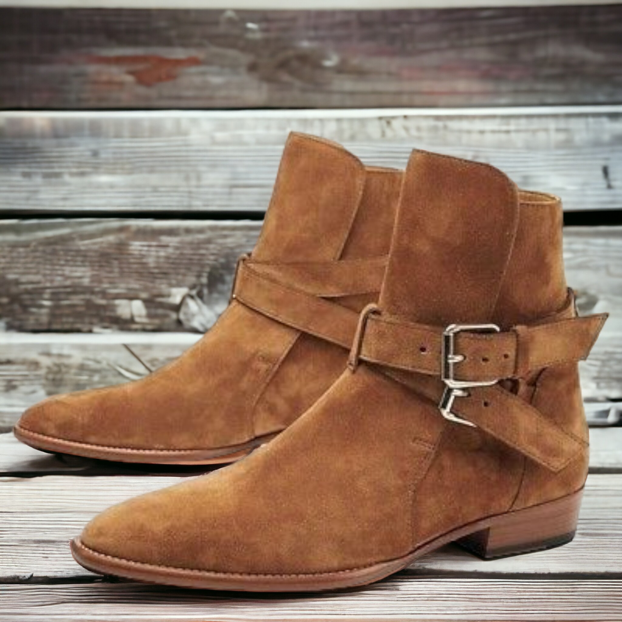 Handmade Men's Tan Suede Boot ,Double Buckle Ankle High boot