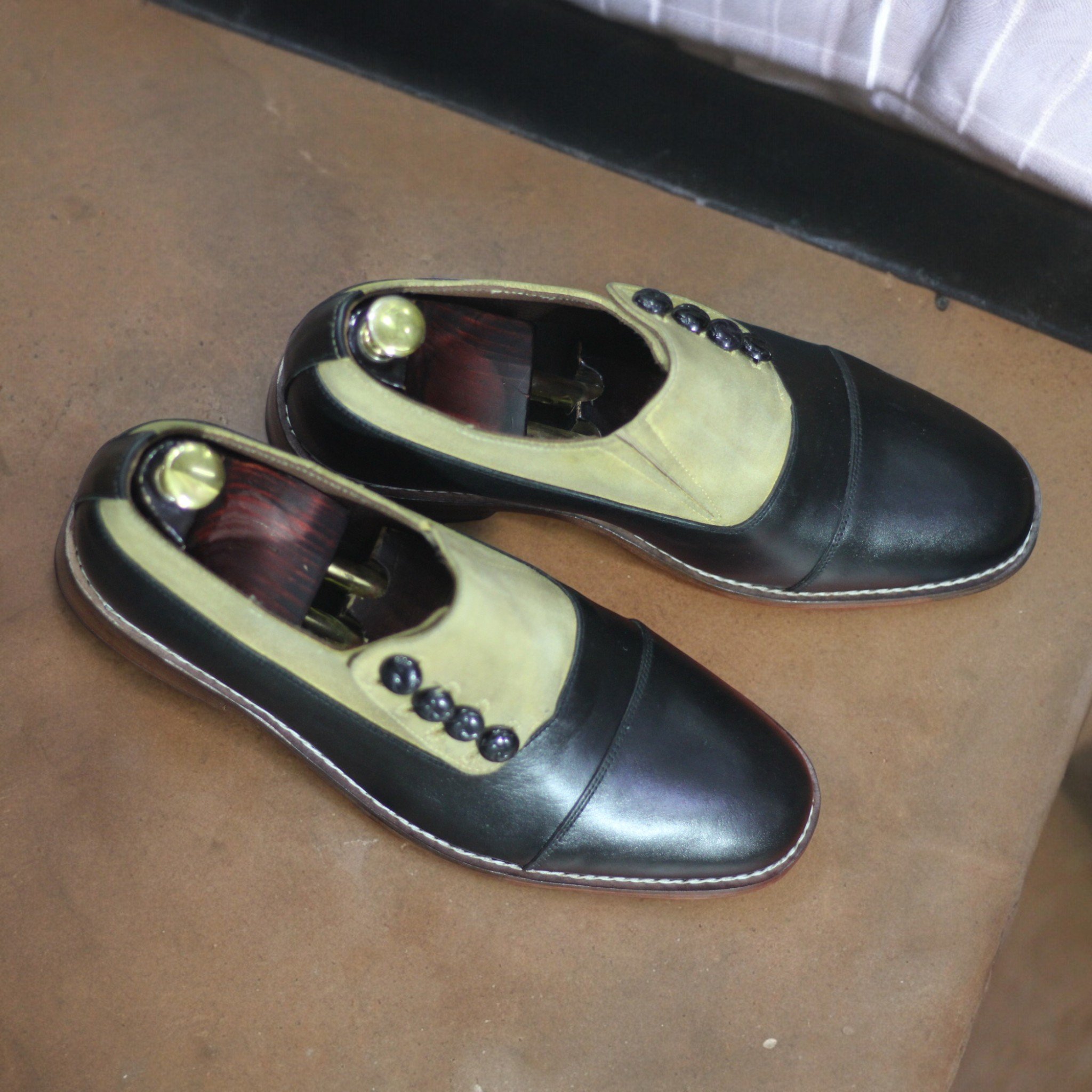 Handmade Men's Black and Sea Green Leather and Suede Shoes ,Side Button Cap Toe Shoes