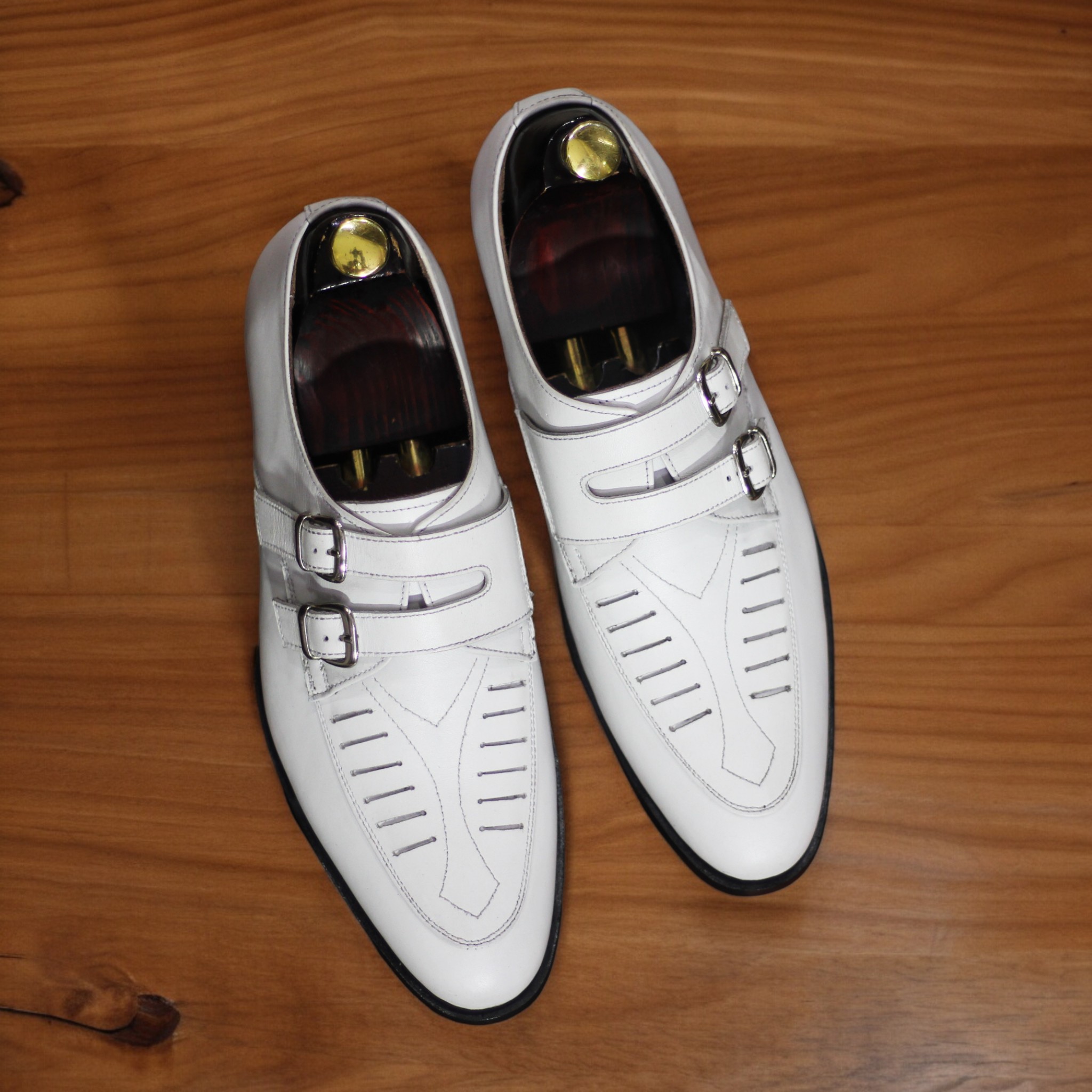 Handmade Men's White Leather ,Side Double Buckle Dress Shoes