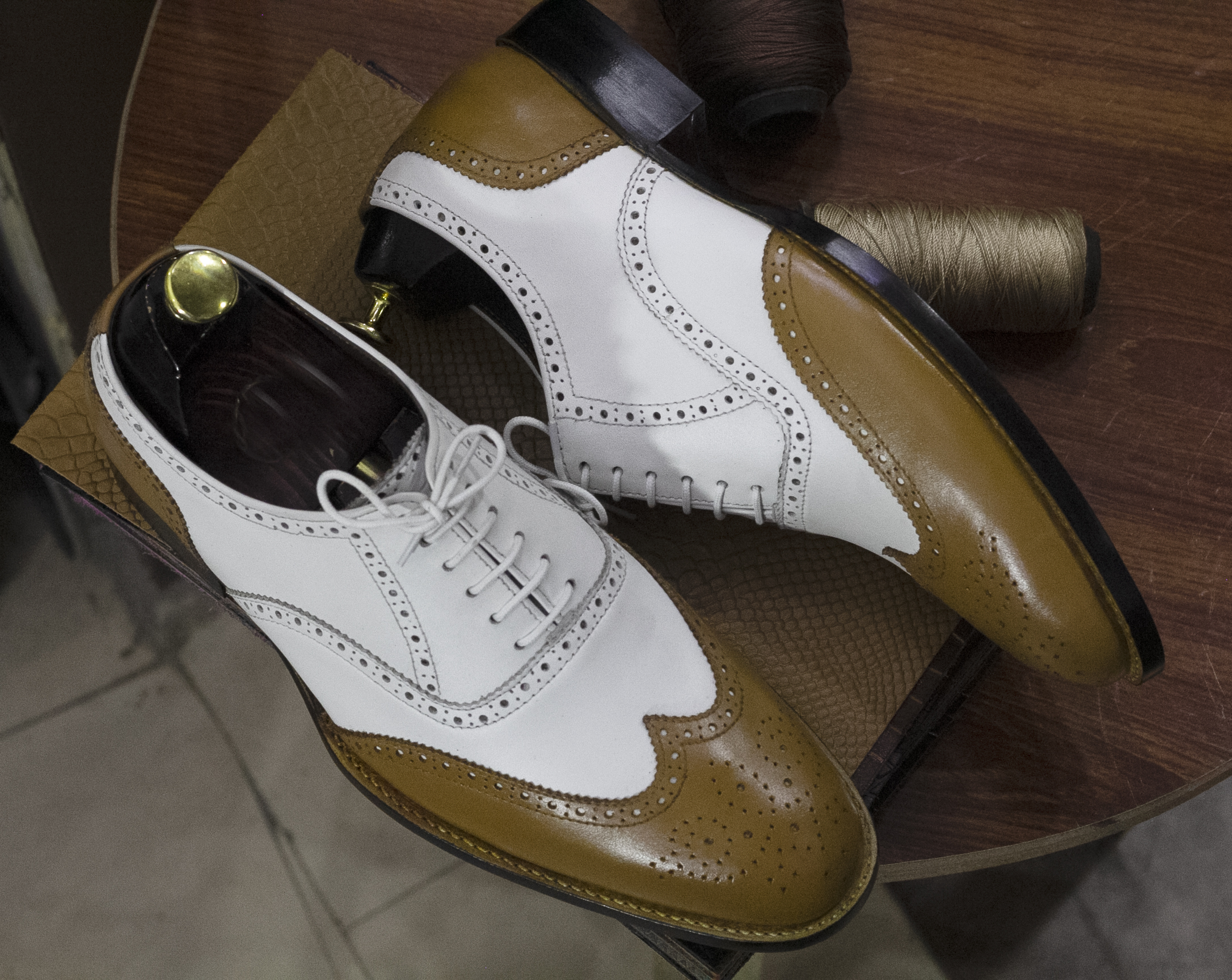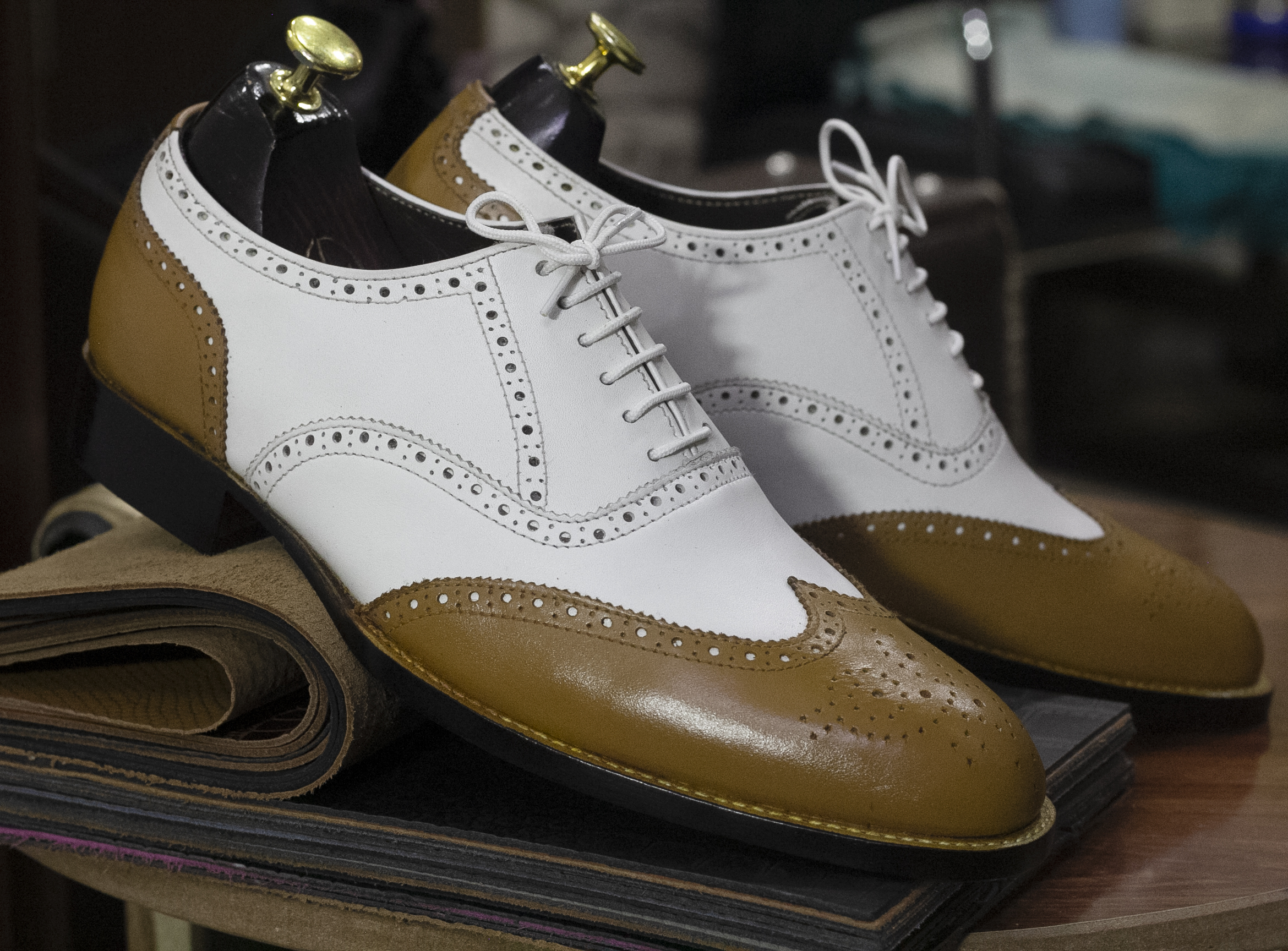 Handmade Men's wings toe white and Brown Leather Brogue Toe Shoes,Lace Up Cap Toe Shoes