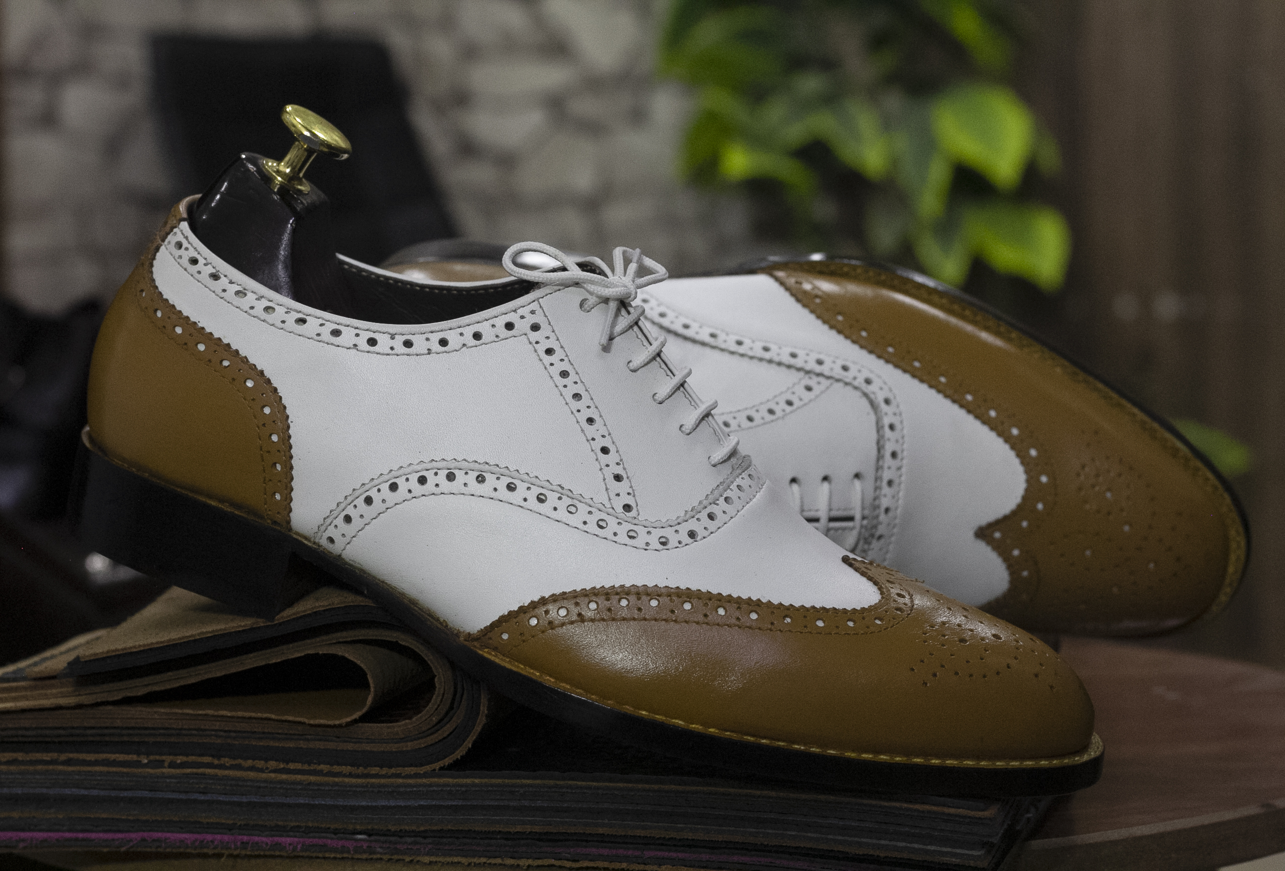 Handmade Men's wings Toe white and Brown Leather Brogue toe Shoes ,Lace Up Cap Toe Shoes