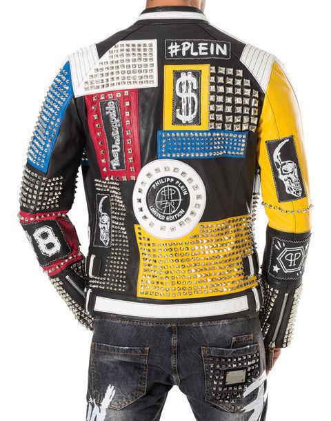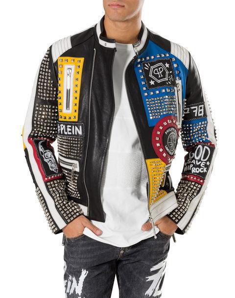 New Philip Multi Color Full Studded Embroidery Patches Leather Jacket Men's