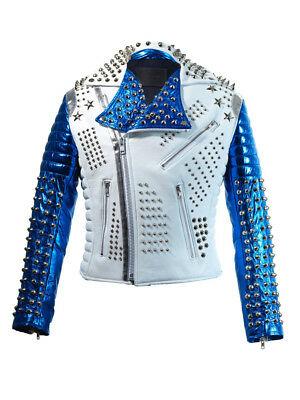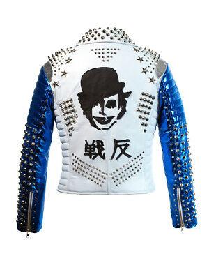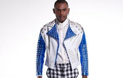 Men's Handmade Victor Luna White Blue Studded Rock Punk Genuine Leather Jacket