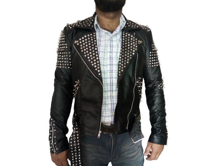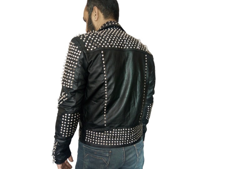 Handmade Black Color Silver Studded Leather Style Men's Zipper Jacket