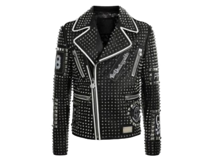Handmade Men's Black Studded Patches Leather White Contrast Zipper Jacket