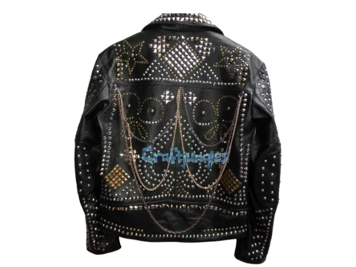 Handmade Men's Designed Green Studded Chains Leather Jacket