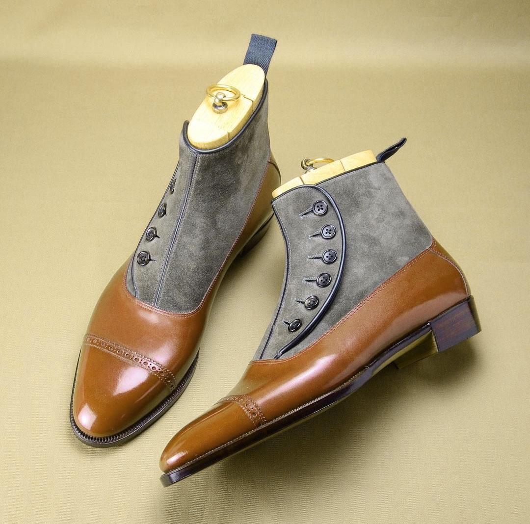 Men's Brown Gray Leather Suede Button Top Ankle High Boot , Handmade Cap Toe Style