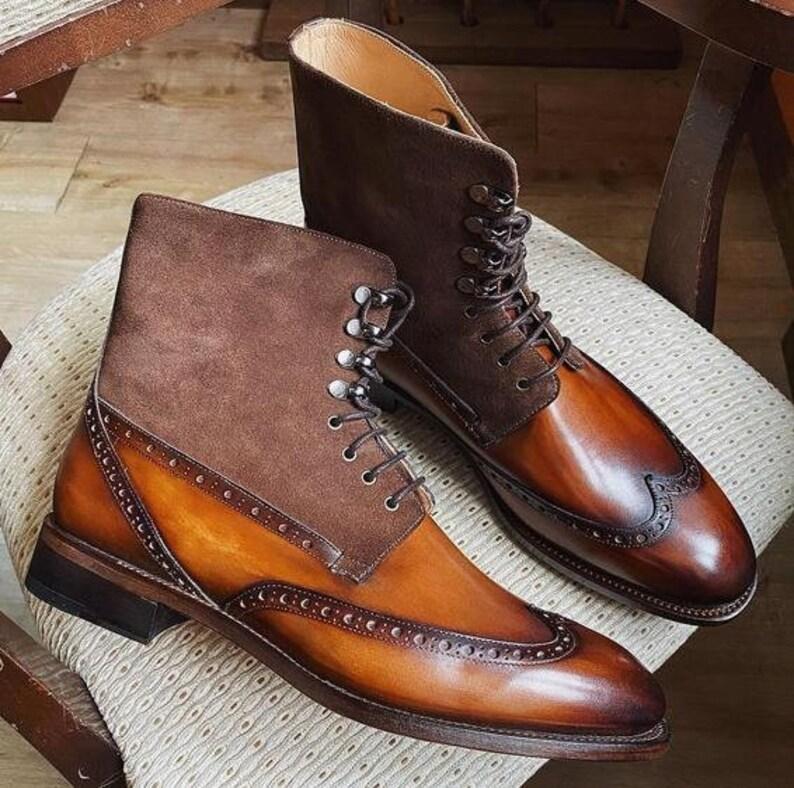 New Pure Handmade Brown Suede & Brown Shaded Leather Lace Up Ankle Boots For Men's
