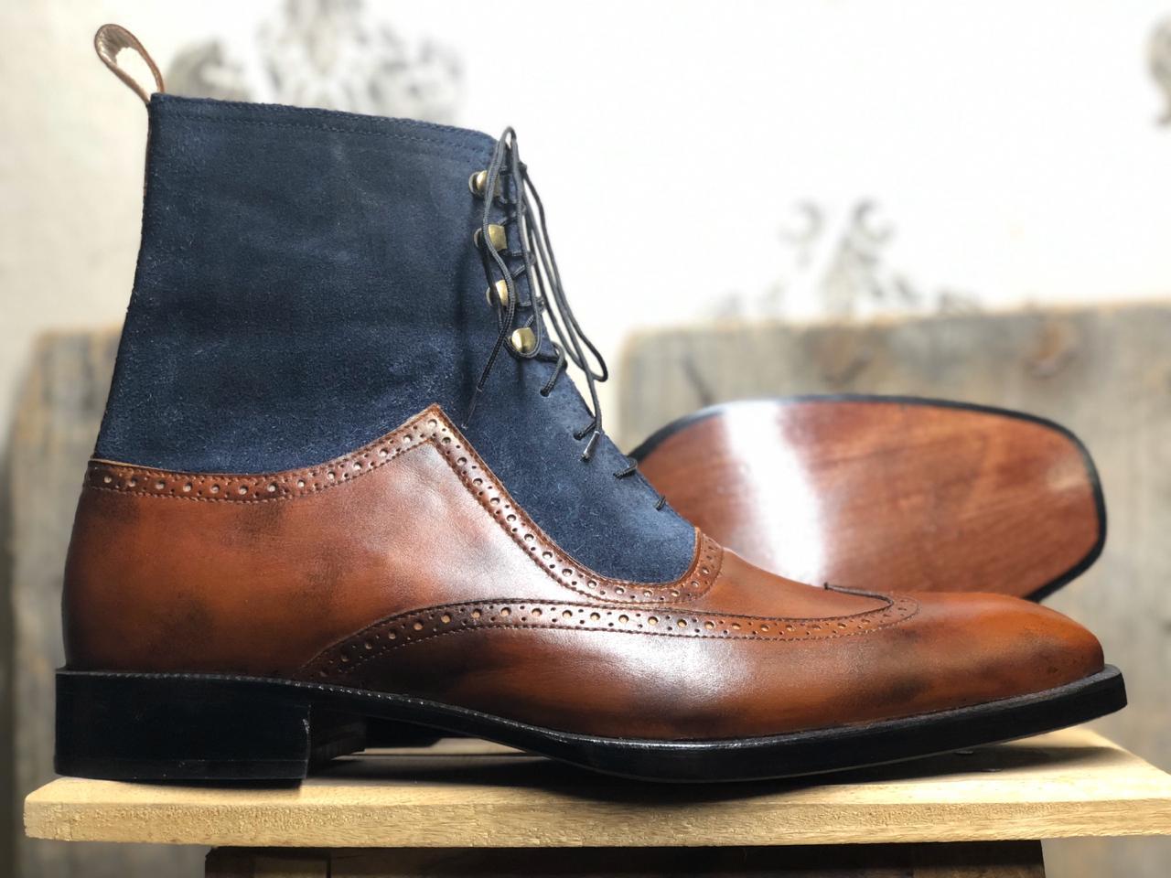 Men's Handmade Ankle High Brown Blue Wing Leather Suede Lace Up Boot