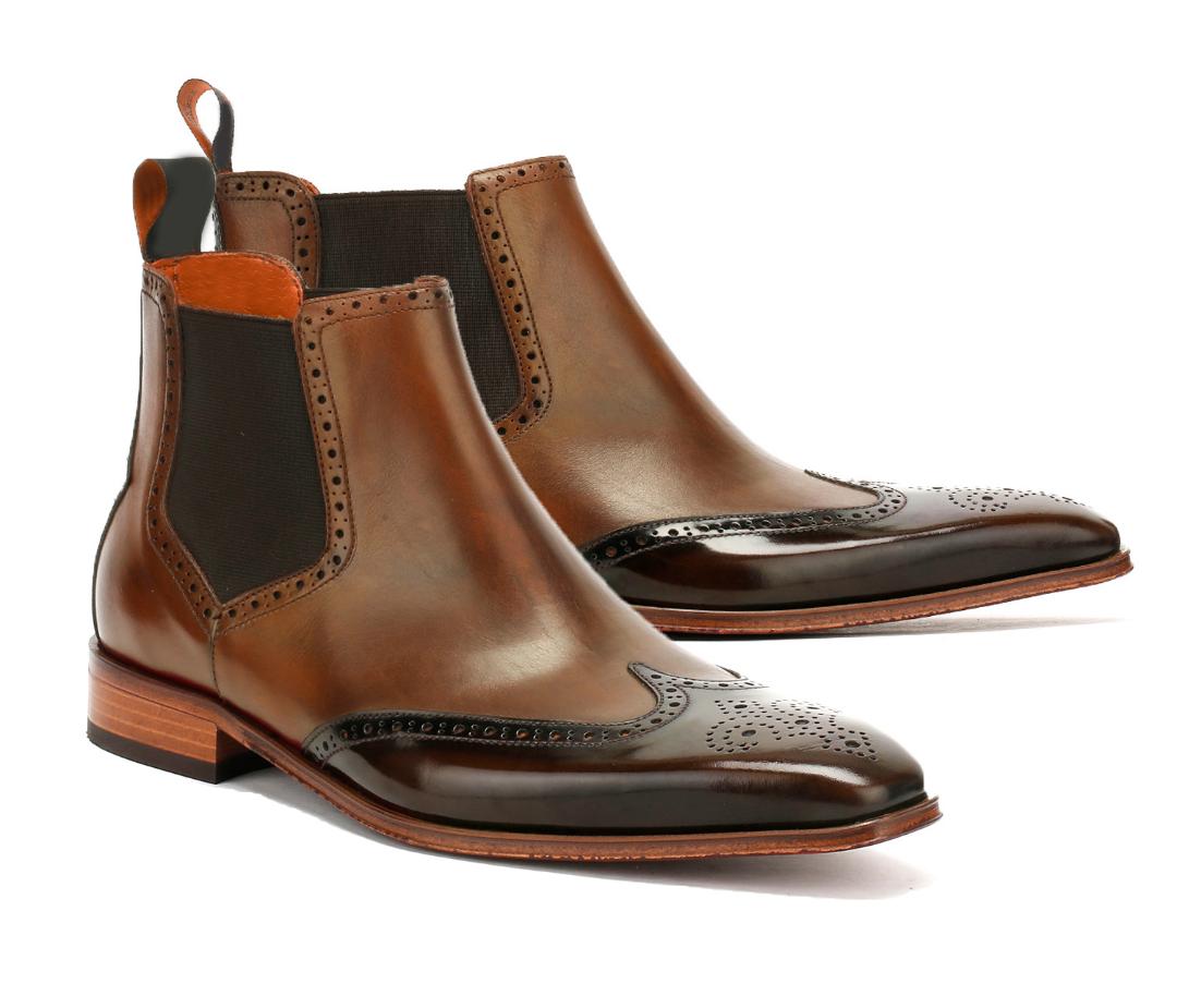 Handmade Brown Color Ankle Wing Tip Chelsea Leather Boots For Men's